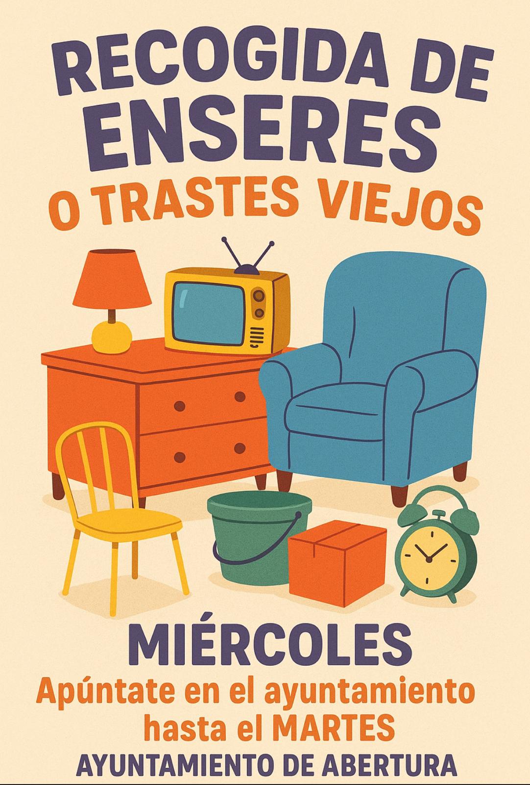 El próximo día 15 de Octubre pasa el camión de los enseres. Los interesados que se apunten en el Ayuntamiento -