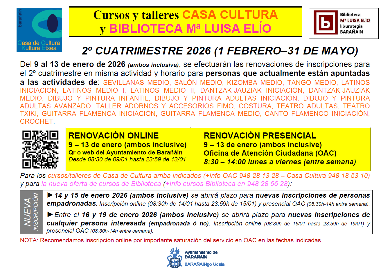 El Ayuntamiento de Barañáin abre plazo de inscripciones en enero de 2026 para renovar la inscripción del primer cuatrimestre en mismo curso y horario (cursos culturales de Casa de Cultura), y/o para nuevas inscripciones en actividades de Casa de Cultura y Biblioteca (nueva oferta de cursos de Biblioteca Mª Luisa Elío). Los cursos son dirigidos para el periodo 2º cuatrimestre (1 febrero-31 de mayo 2026) del curso 2025/2026 (desde el 1 de febrero hasta el 31 de mayo de 2026 en el (...)