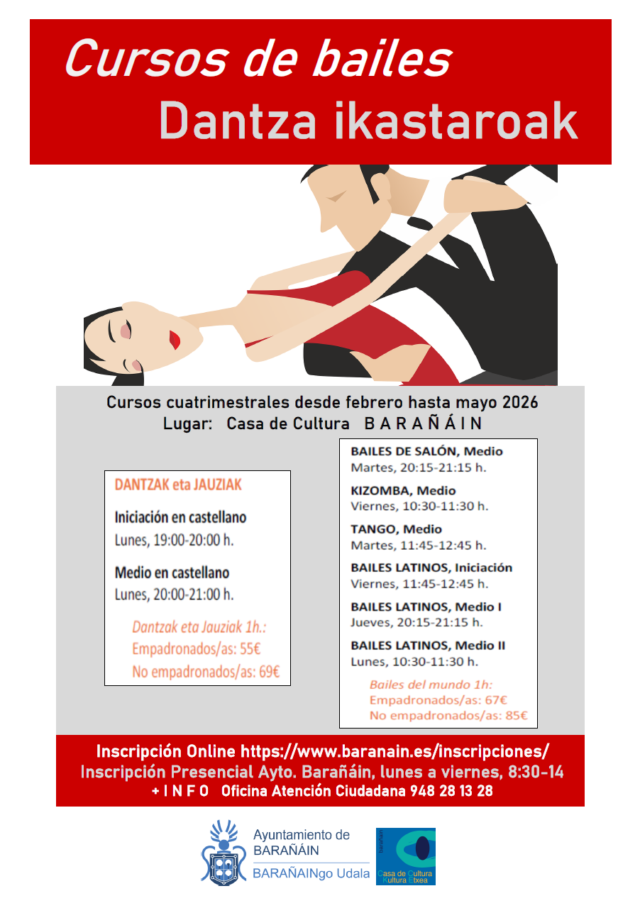 El Ayuntamiento de Barañáin informa de las fechas de comienzo de las clases para el 2º cuatrimestre (continuación del primer cuatrimestre cuyas sesiones finalizan el 31 de enero):Cursos culturales Casa de Cultura 2025-2026 Comienzo Clases 2º cuatrimestre Febrero 2026 (pdf)
