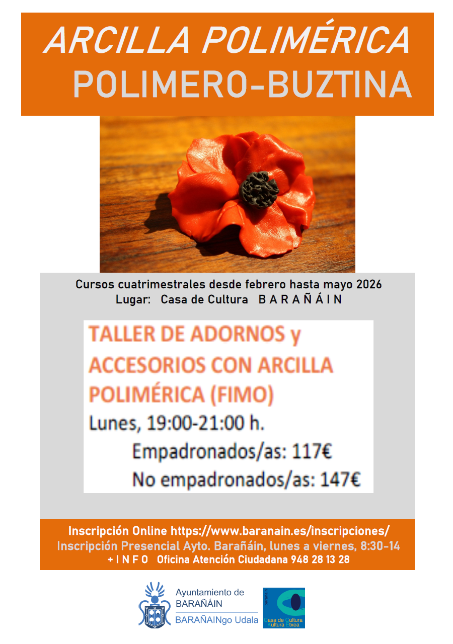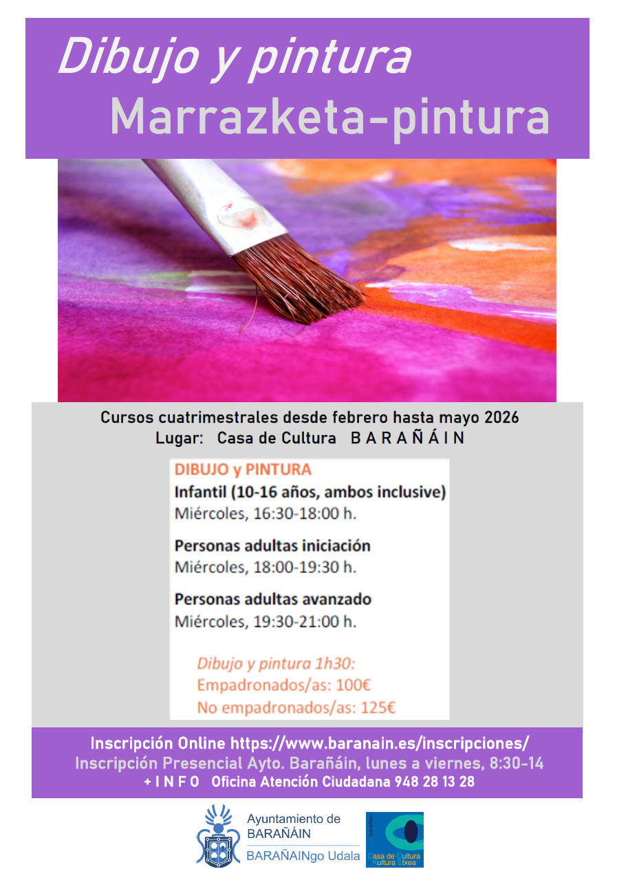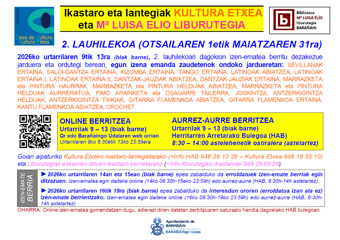 Barañaingo Udalak 2026ko urtarrilean irekiko du izena emateko epea, Kultura Etxeko kultura-jardueretan 1. lauhilekoan izena emanda zaudetenok 2. lauhilekorako izen-ematea berritzeko (ikastaro eta ordutegi berean) eta/edo Kultura Etxeko eta Liburutegiko jardueretan izen-emate berriak egiteko (Kultura Etxeko ikastaroak eta Mª Luisa Elio liburutegiko ikastaroen eskaintza berria). Ikastaroak 2025/2026 ikasturteko 2. lauhilekorako (2026ko otsailaren 1etik maiatzaren 31ra) zuzenduak dira (K(...)
