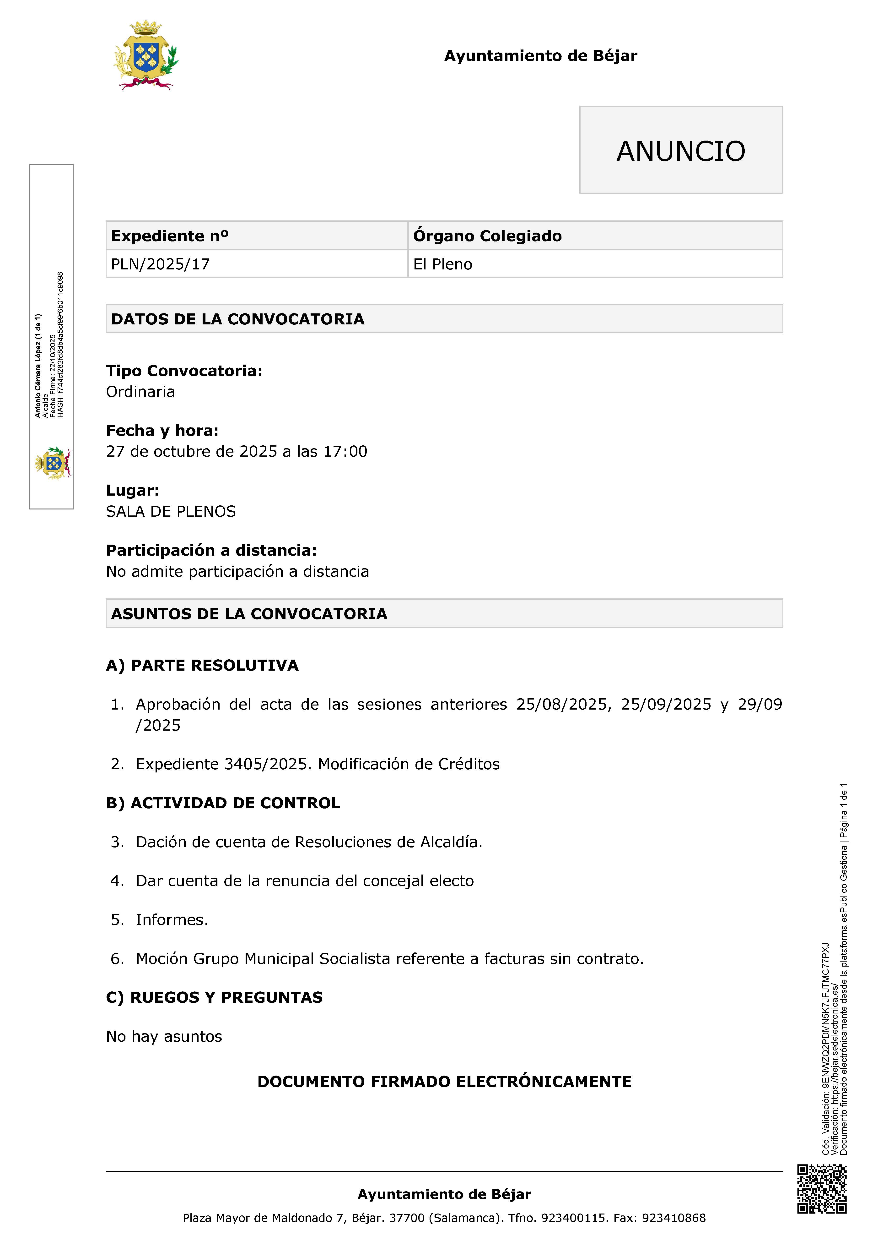 El Ayuntamiento de Béjar celebrará la sesión plenaria correspondiente a este mes de octubre el próximo lunes día 27 de octubre, a las 17:00h con los siguientes asuntos: