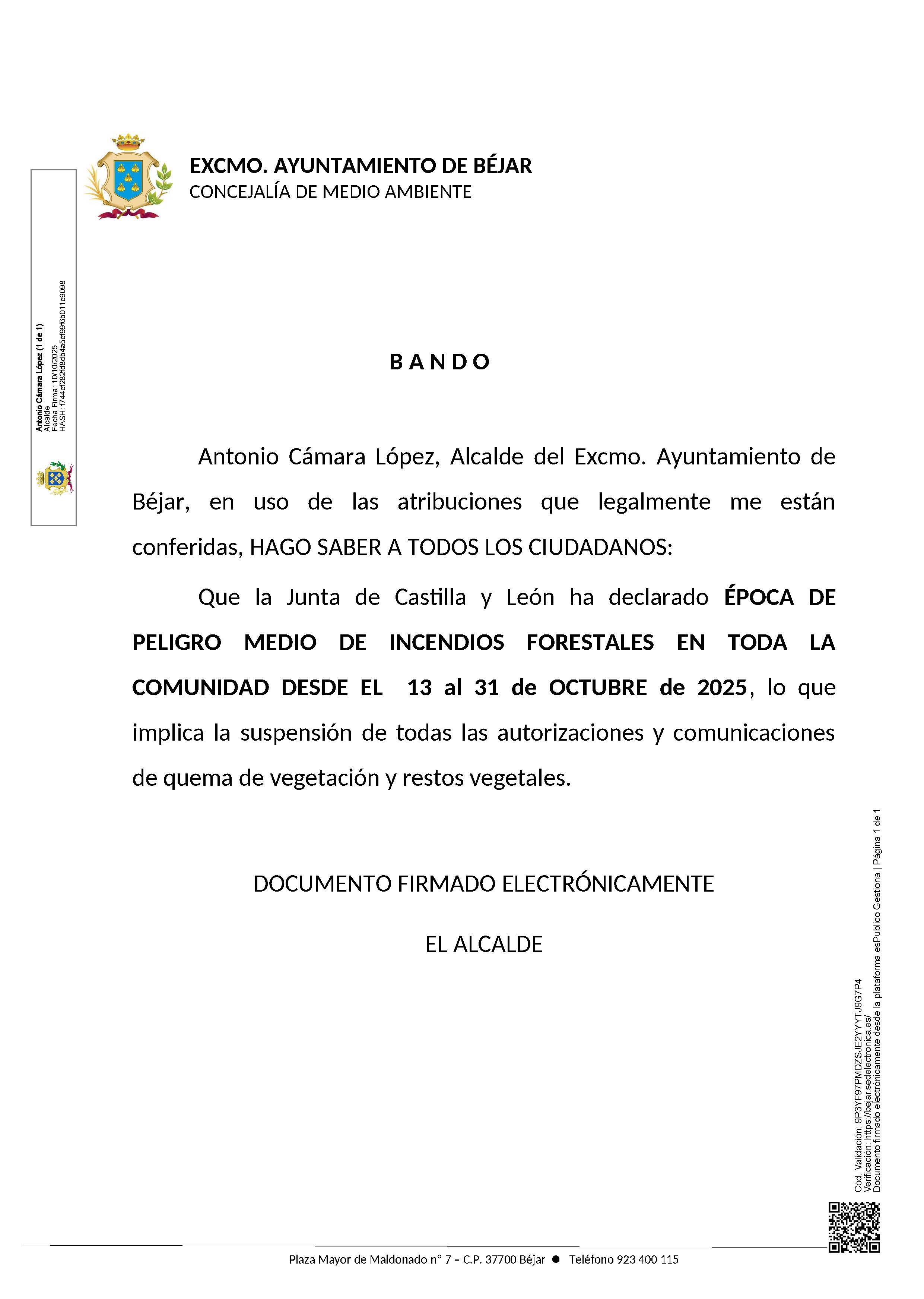 ANTONIO CÁMARA LÓPEZ, Alcalde del Excmo. Ayuntamiento de Béjar, en uso de las atribuciones que legalmente me están conferidas, HAGO SABER A TODOS LOS CIUDADANOS QUE: