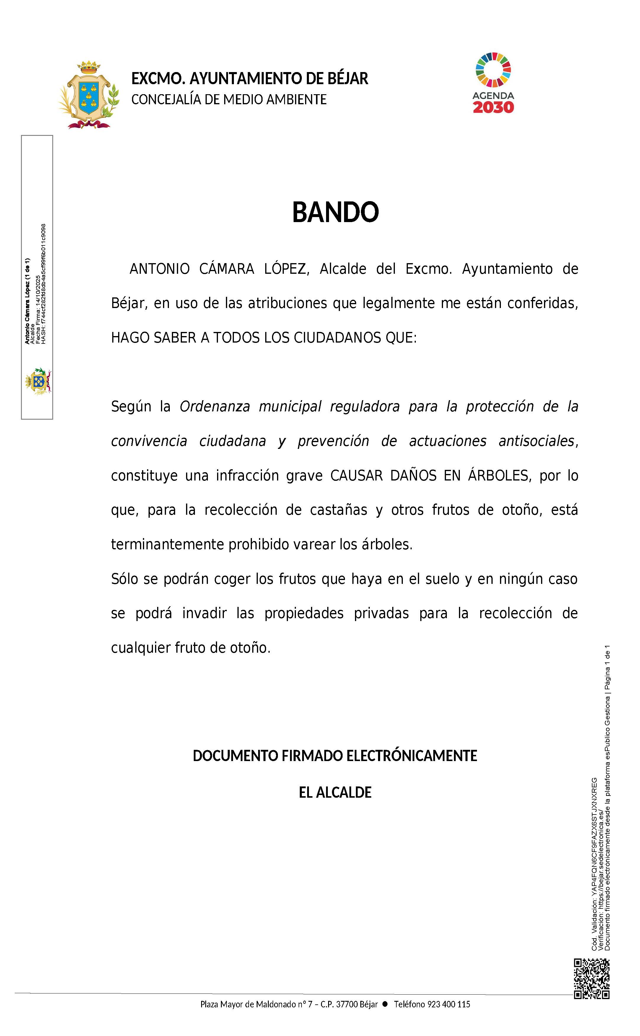 Según la Ordenanza municipal reguladora para la protección de la convivencia ciudadana y prevención de actuaciones antisociales, constituye una infracción grave CAUSAR DAÑOS EN ÁRBOLES, por lo que, para la recolección de castañas y otros frutos de otoño, está terminantemente prohibido varear los árboles.