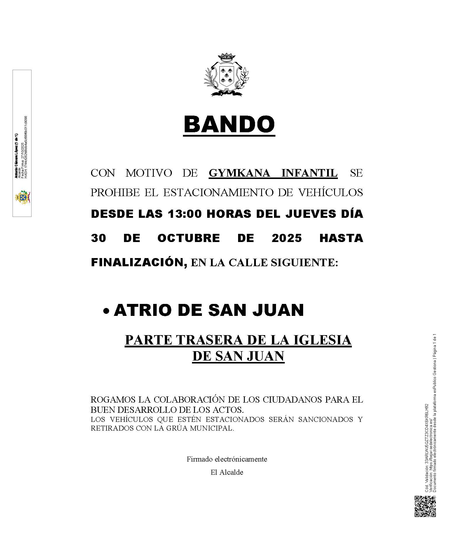 Con motivo de la gymkana infantil, por la zona de San Juan con motivo de la programación de Halloween, se prohíbe el estacionamiento de vehículos desde las 13:00 horas del jueves día 30 de octubre de 2025 hasta finalización de la actividad, en la calle siguiente: