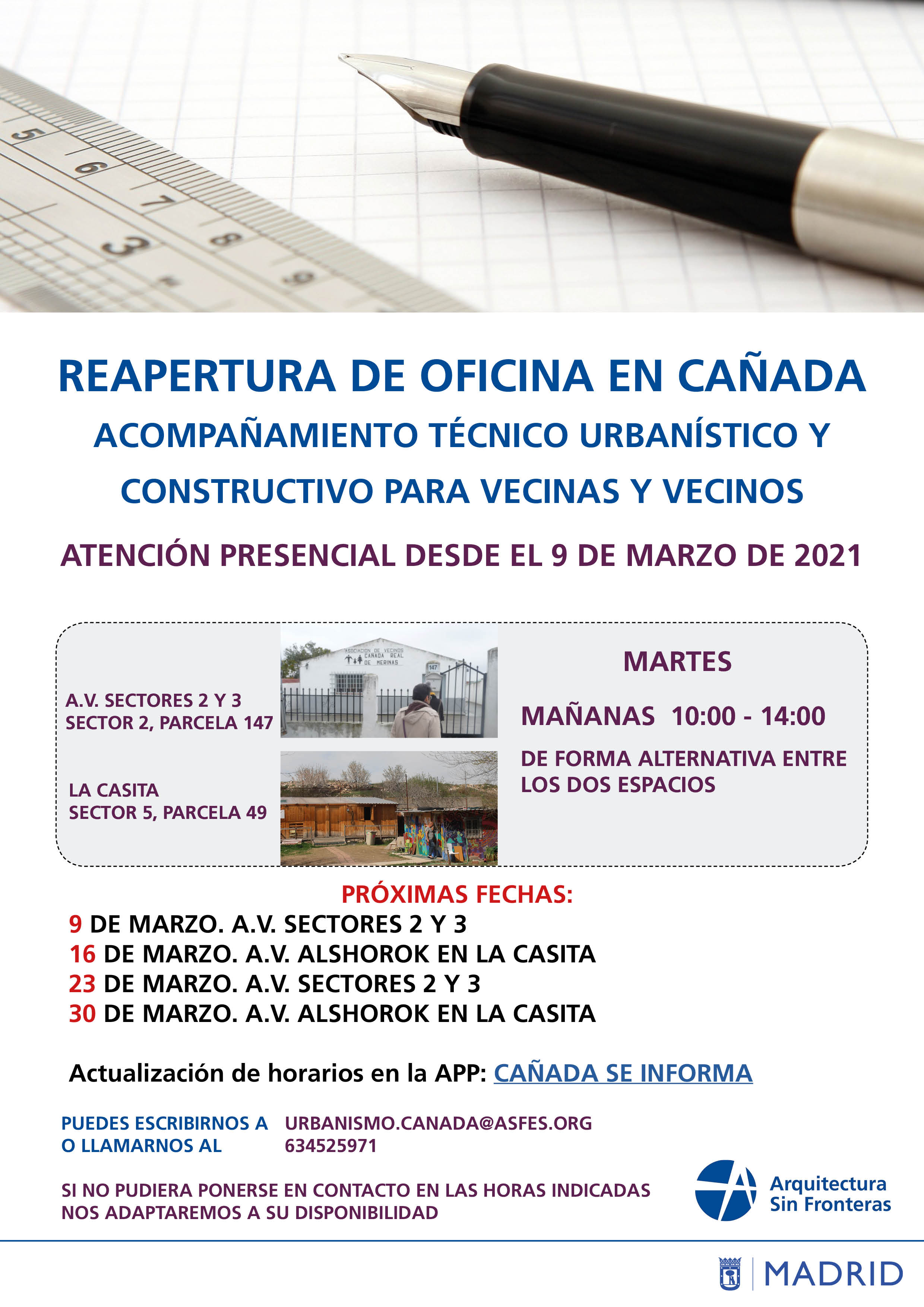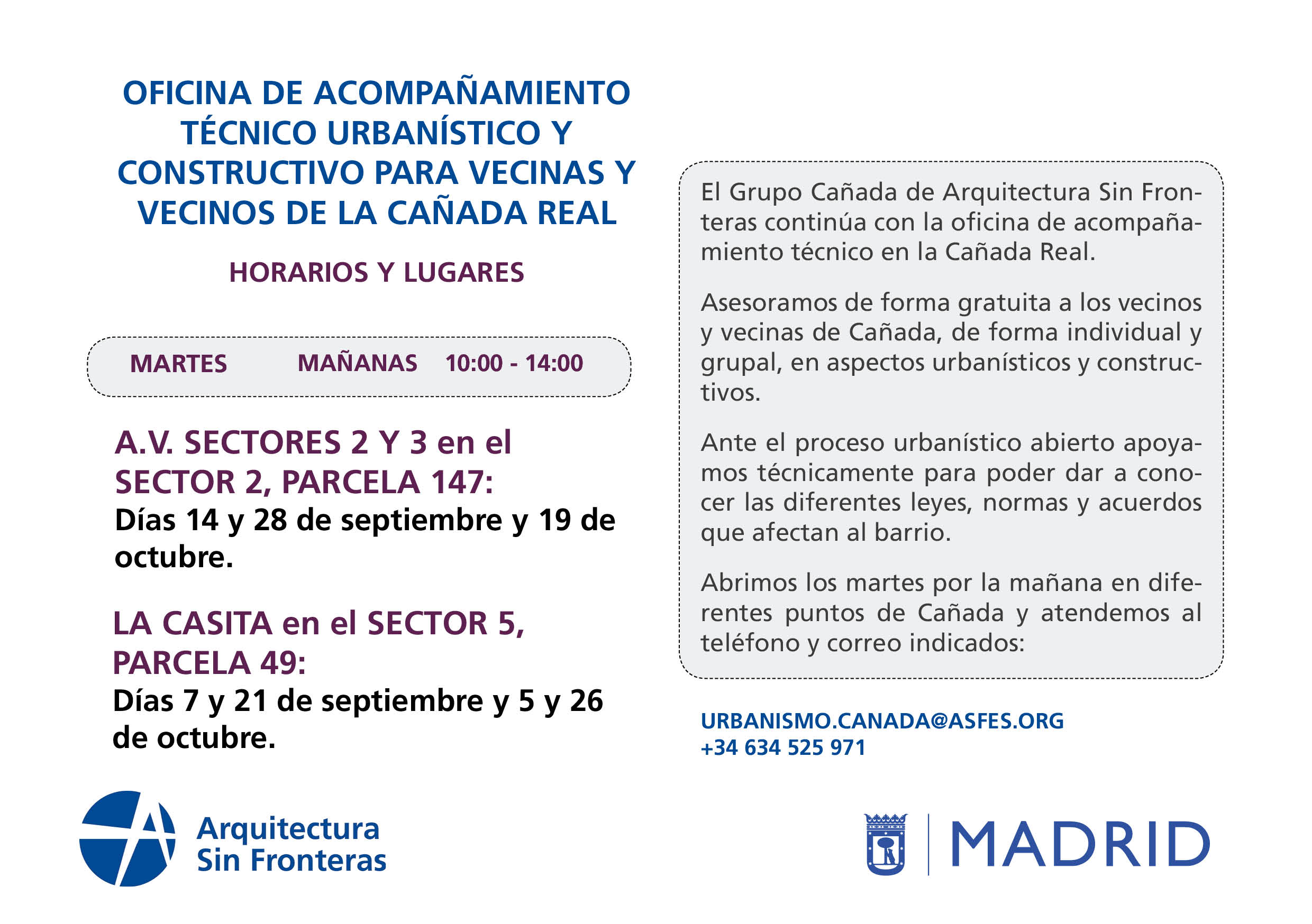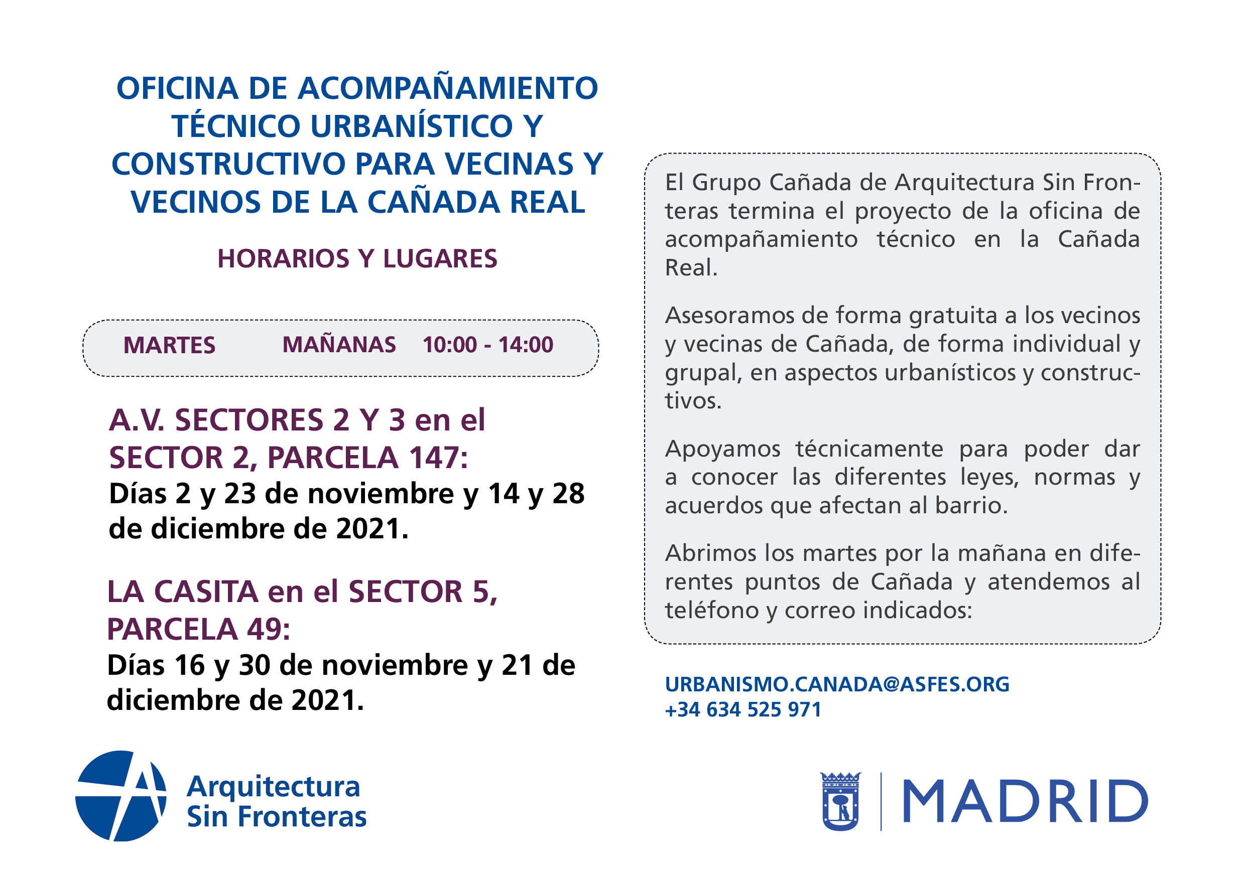 Desde Arquitectura Sin Fronteras volvemos a abrir la oficina de asesoramiento técnico para atender a toda la población de la Cañada Real. Estaremos disponibles los martes, de 10:00 a 14:00 en las sedes de la Asociación de Vecinos Cañada Real de Merinas de los Sectores 2 y 3 y la Asociación Vecinal Alshorok en el Sector 5.