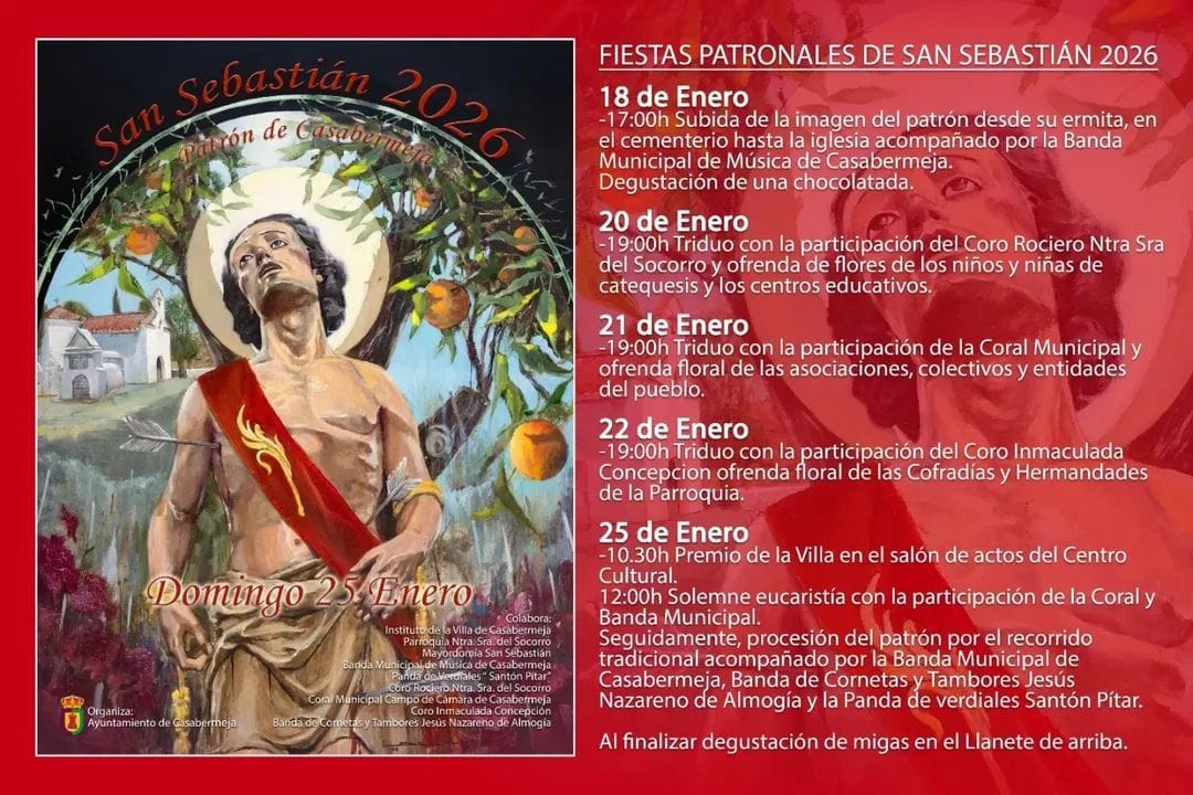 El Ayuntamiento de Casabermeja recuerda a todos los vecinos y vecinas que el próximo lunes 26 de enero será festivo local con motivo de la celebración de San Sebastián, Patrón de nuestro municipio.
