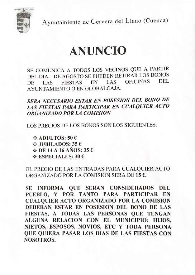 Hoy día 4 a las 11.30 se inicia la venta de bonos en el Ayuntamiento viejo.( plaza Mayor) -