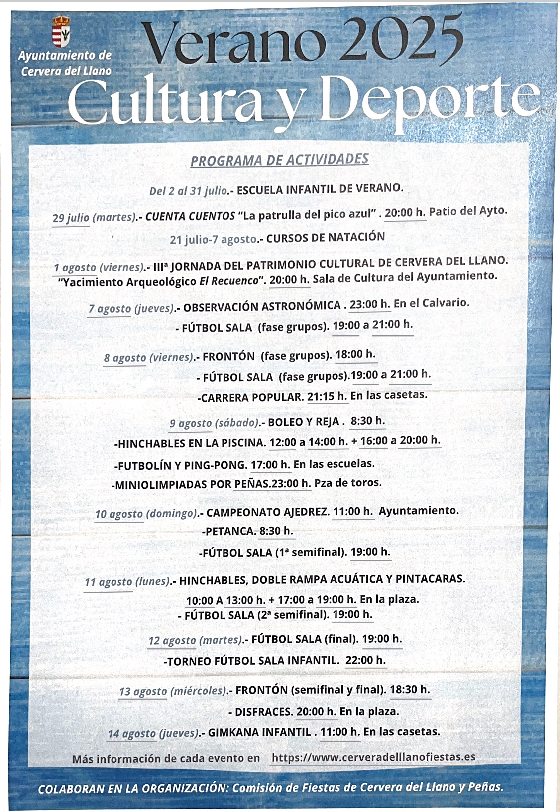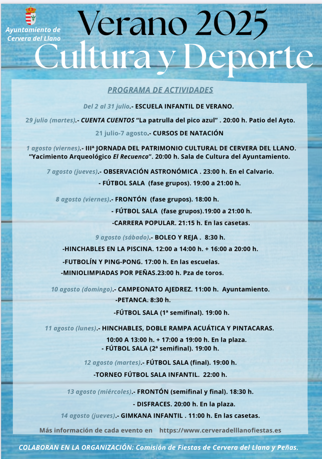 El viernes 1 de agosto se celebrará la IIIª Jornada del Patrimonio Histórico y Cultural de Cervera del Llano. Este año será "El Yacimiento Arqueológico del Cerro del Recuenco".(declarado Bien de Interés Cultural desde 1984) el tema que expondrá D. Pedro E. Álvarez Martínez.