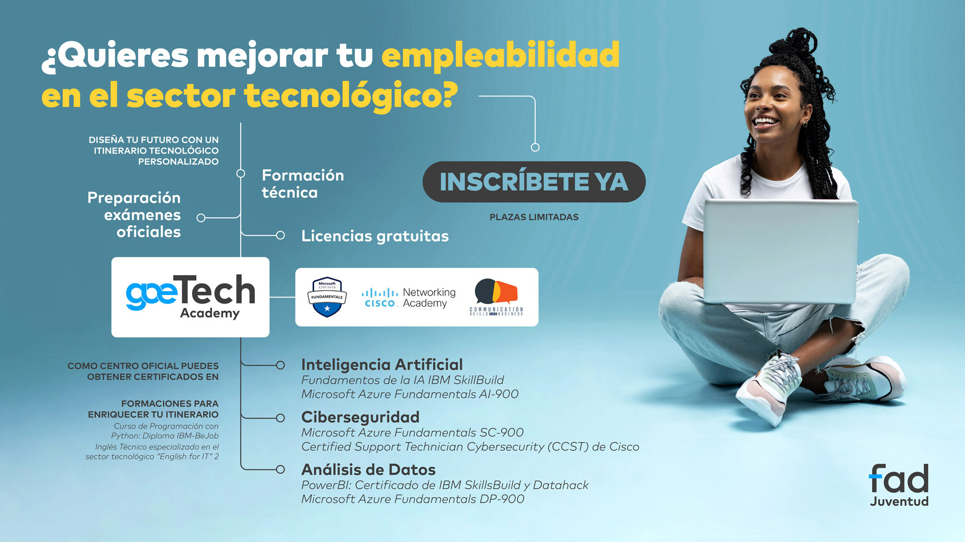 👉 El programa ha arrancado el 3 de septiembre y ofrece la oportunidad de formarse en áreas con gran demanda laboral y obtener certificaciones oficiales reconocidas internacionalmente, de la mano de entidades como IBM SkillsBuild, Cisco, Microsoft e IT Specialist.