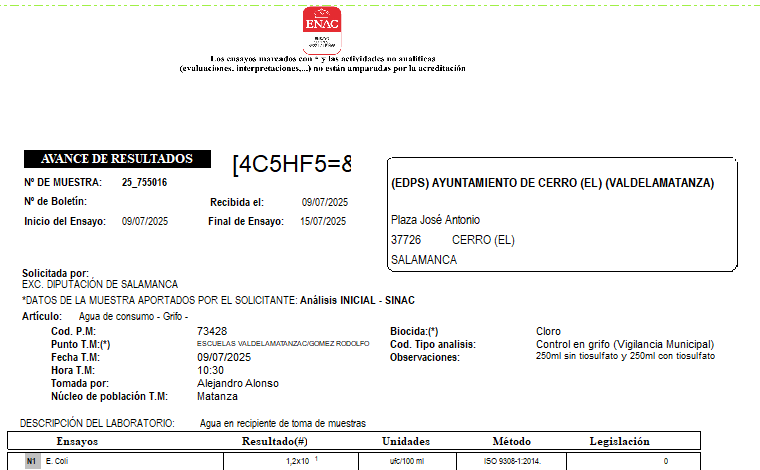 Se hace constar, que ya se tiene el nuevo informe analítico del agua de Valdelamantaza, y ya es apta para consumo humano