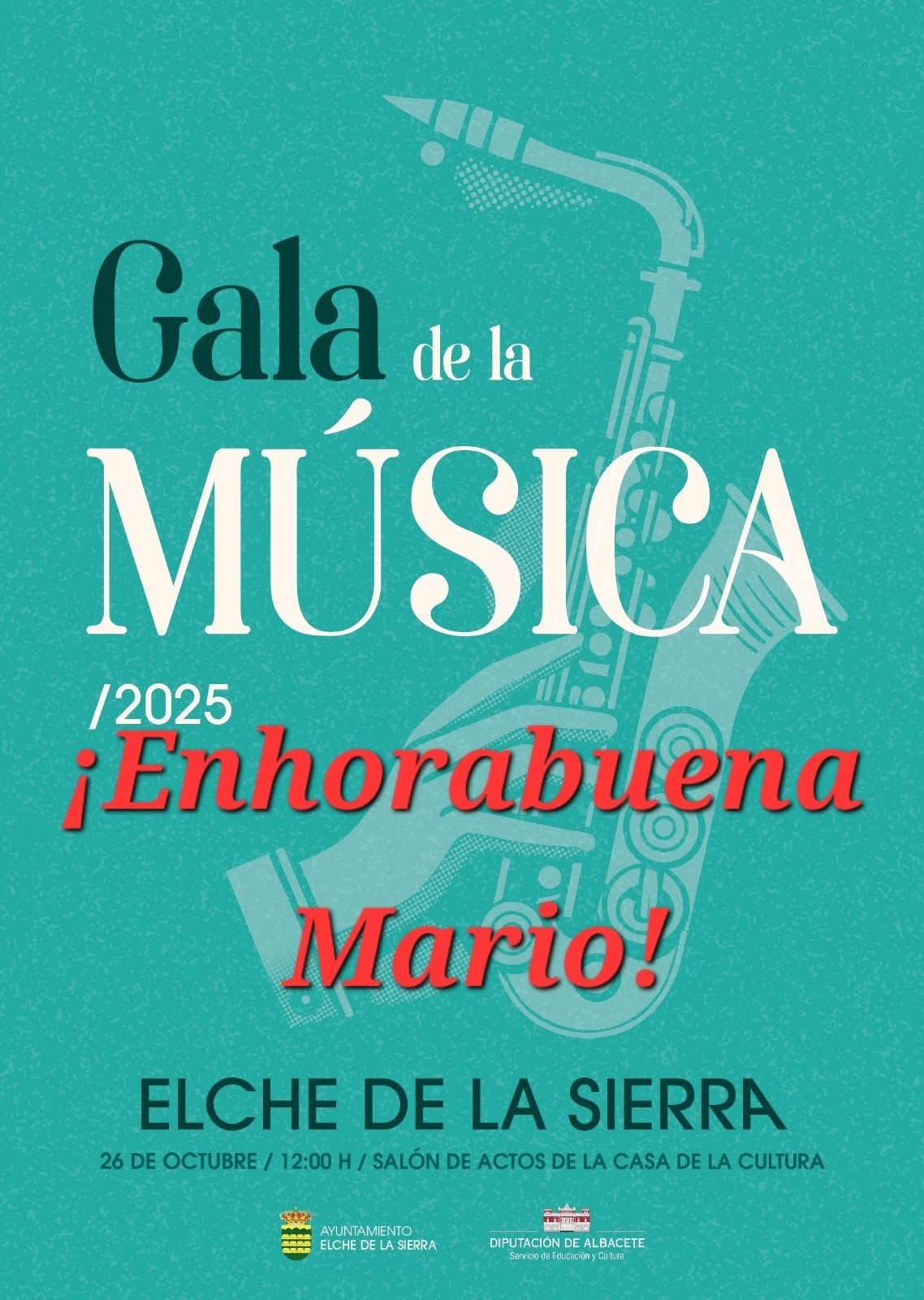 Desde el Ayuntamiento queremos trasladar nuestra enhorabuena a Mario Tarraga Jimenez por su nombramiento como Músico Destacado, por la Diputación de Albacete, en la próxima Gala de la Música que se celebrará el próximo domingo 26 de octubre en Elche de la Sierra. 👏🎉