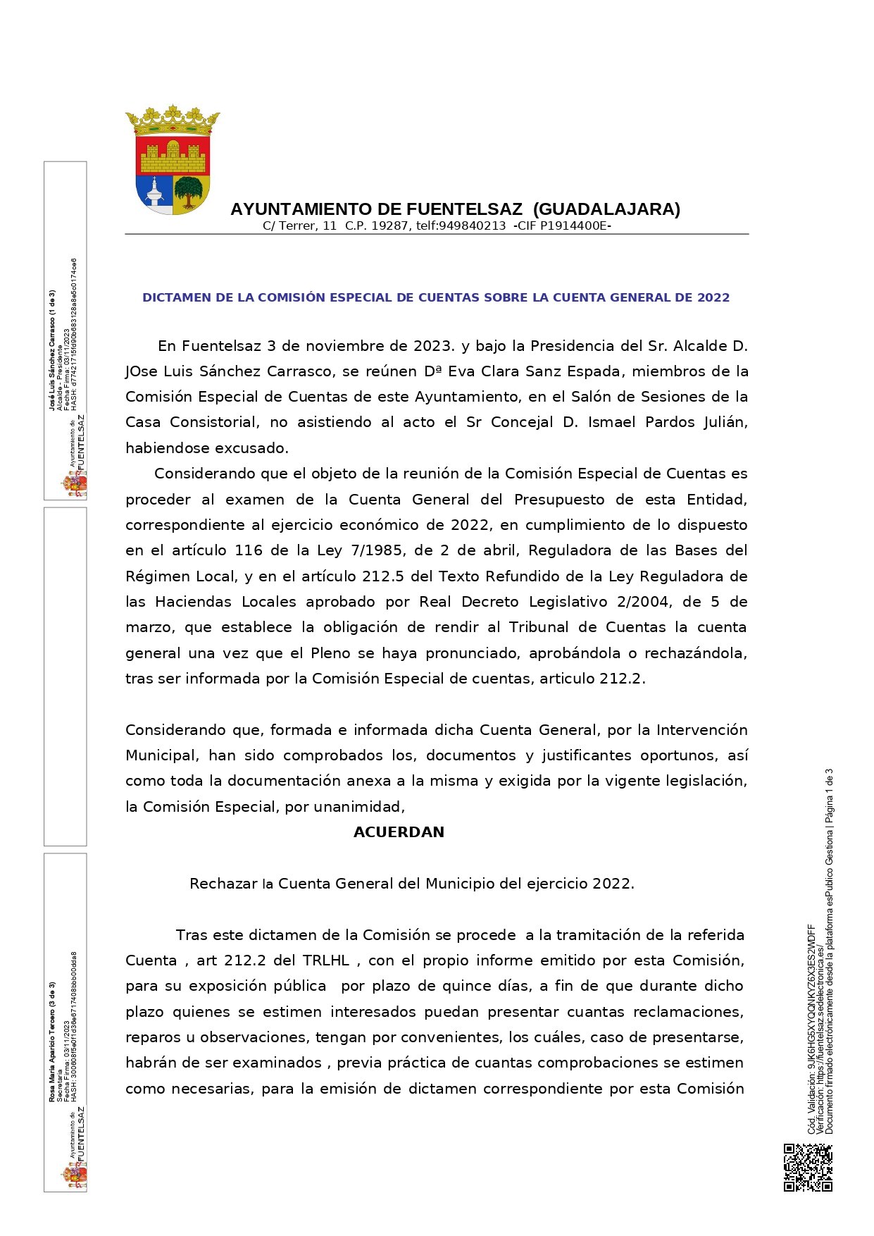 Se adjunta el acta del Dictamen de la Comisión Especial de Cuentas sobre la Cuenta General del ejercicio 2022 y los documentos relativos a dicha Cuenta General.