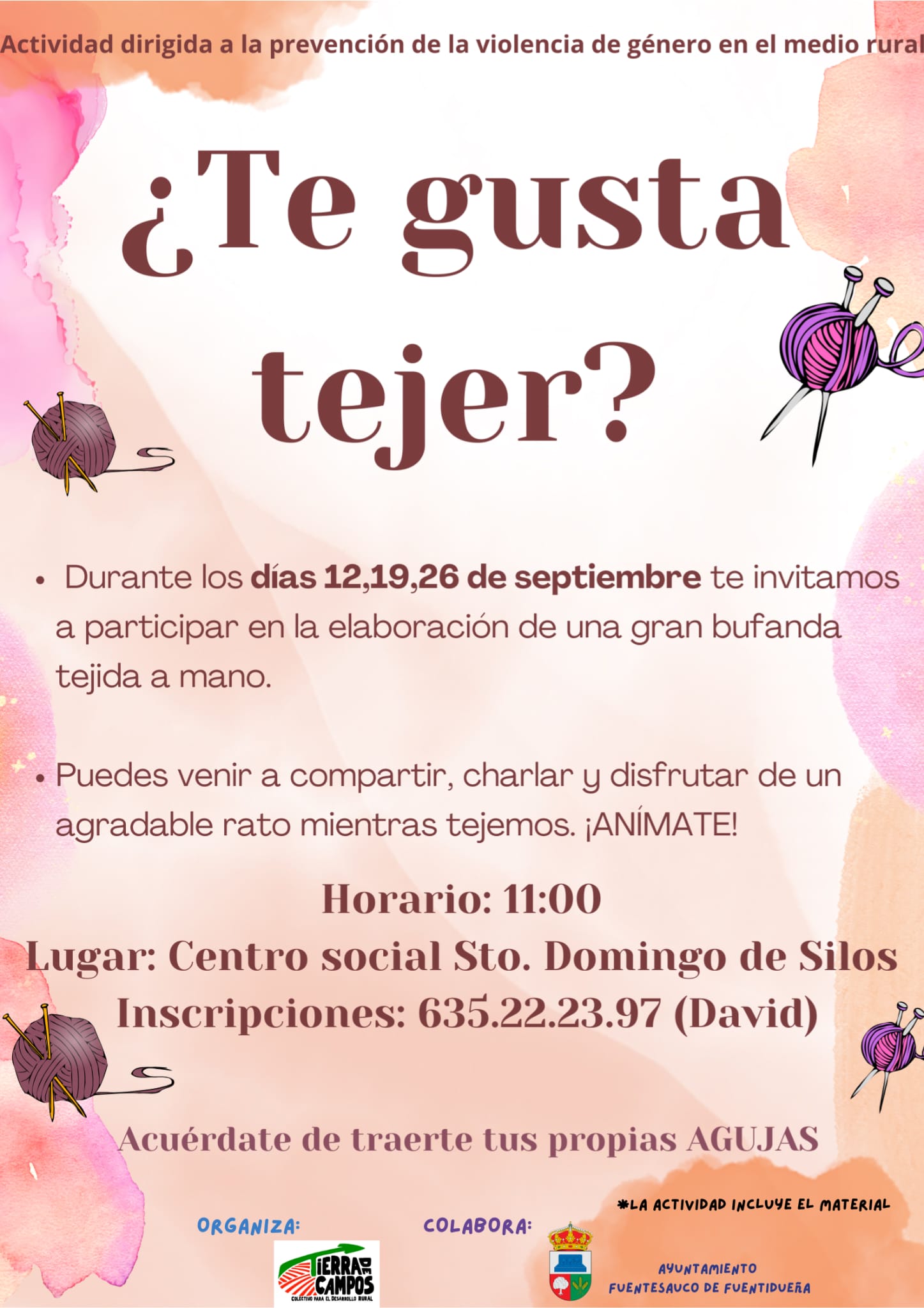 ¿TE GUSTA TEJER?Info General04-Septiembre-2025 12:40 LOS DÍAS 12, 19 Y 26 DE SEPTIEMBRE A LAS 11 DE LA MAÑANA, EN EL CENTRO SOCIAL STO DOMINGO DE SILOS, TE INVITAMOS A PARTICIPAR EN LA ELABORACIÓN DE UNA GRAN BUFANDA TEJIDA A MANO.