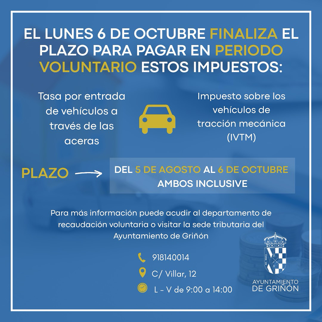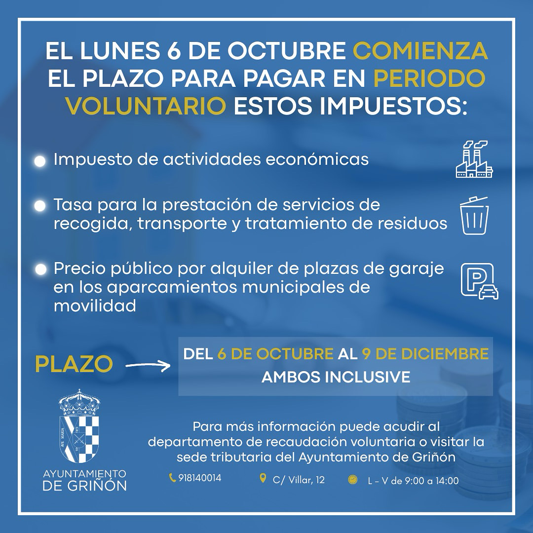 Para más información puede acudir al departamento de recaudación voluntaria o visitar la sede tributaria del Ayuntamiento de Griñón en horario de L-V de 9:00h a 14:00h