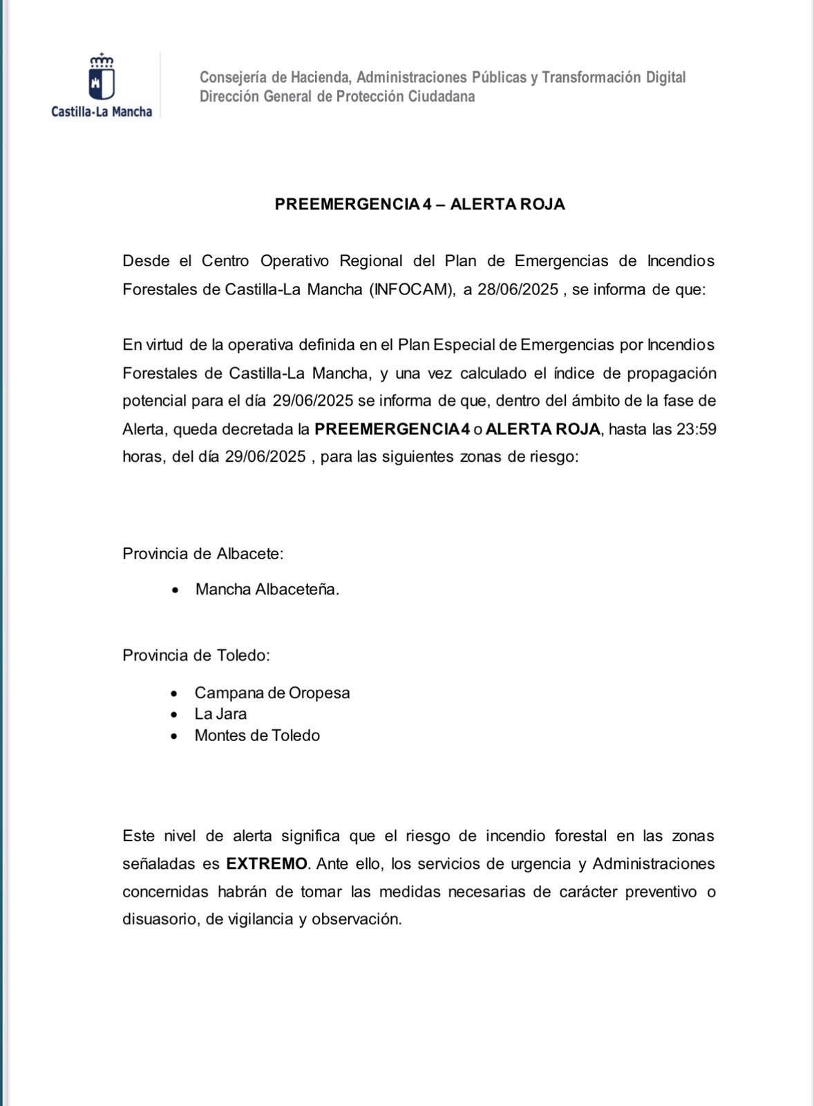 Centro Operativo Regional de Incendios Forestales informa de riesgo extremo de incendio forestal en La Jara y Campana de Oropesa (Toledo) para el dia 16/07/2025. Emergencias 112 -