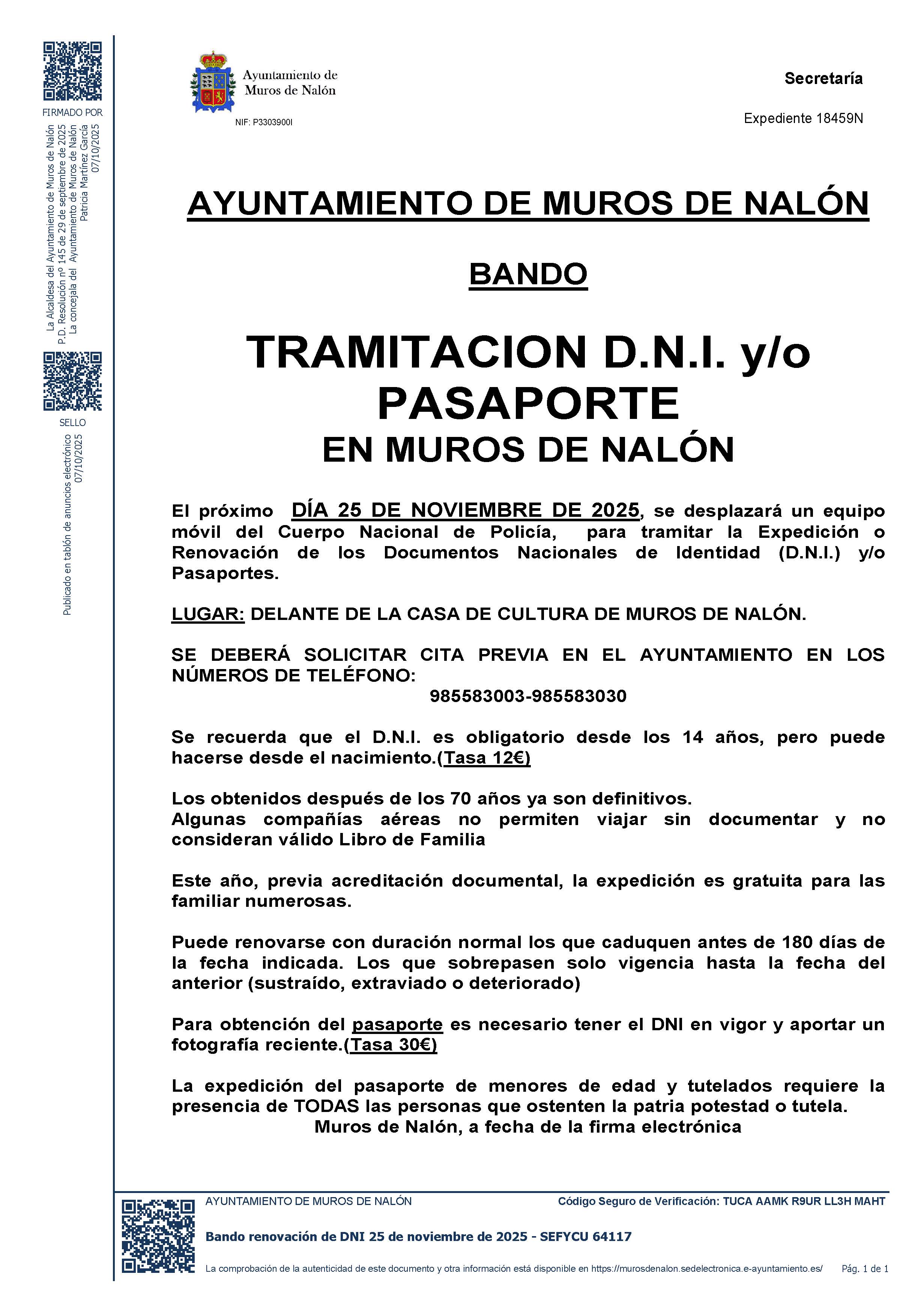 El próximo 25 de noviembre, se desplazará un equipo móvil del Cuerpo Nacional de Policía para tramitar la Expedición o Renovación de los Documentos Nacionales de Identidad (DNI) y/o Pasaportes a Muros de Nalón.