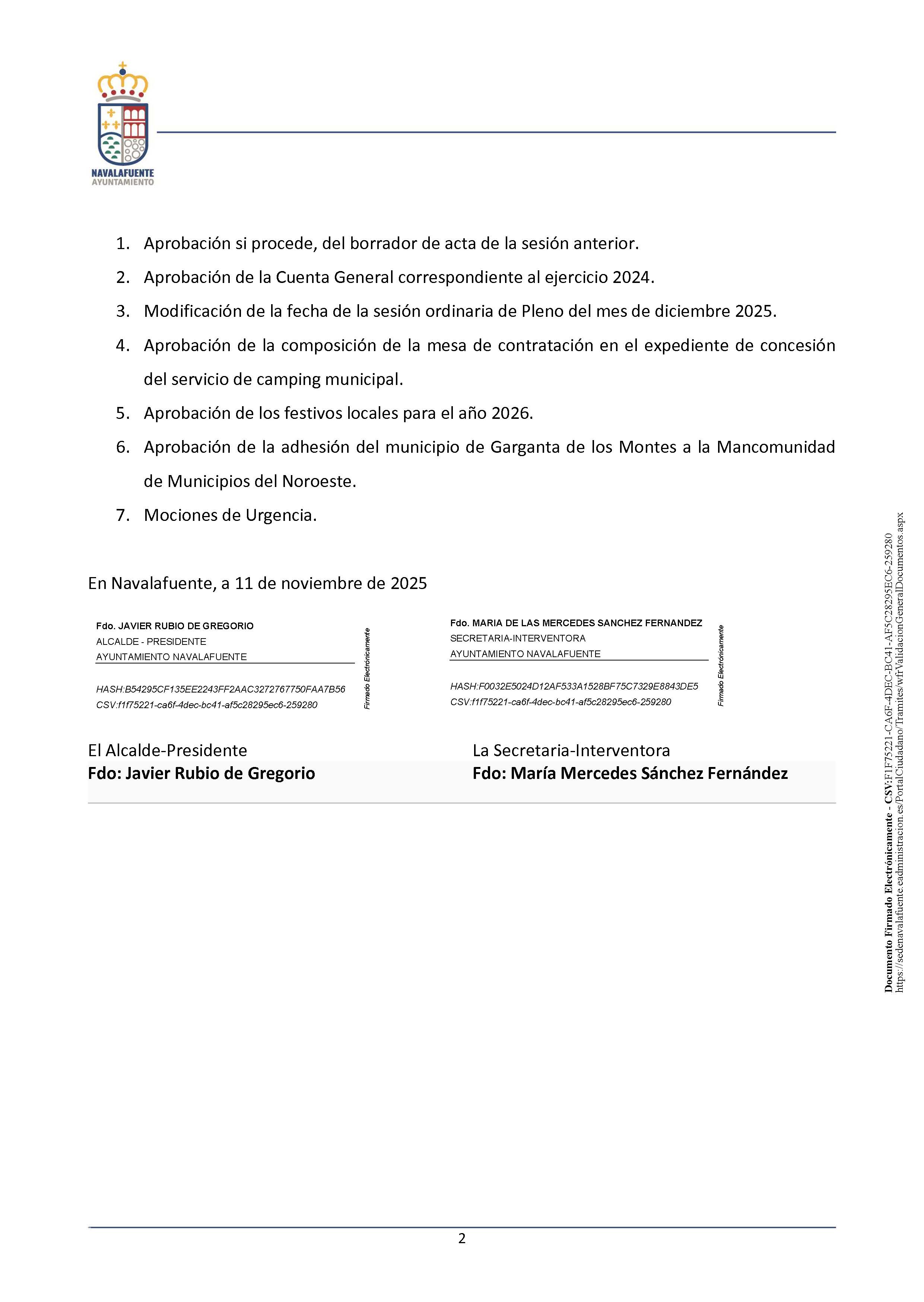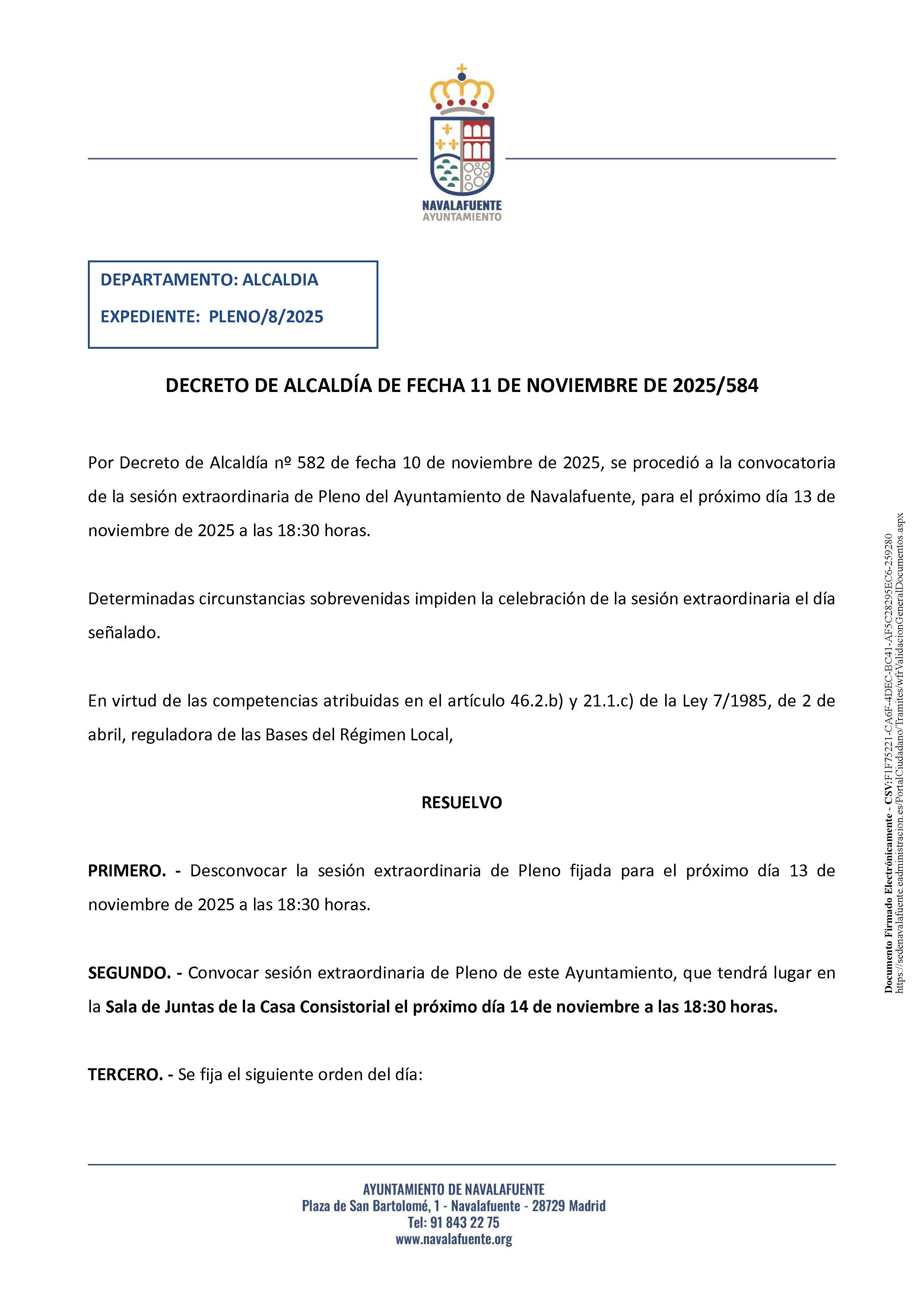 Mediante el Decreto nº 582/2025, dictado por el Alcalde-Presidente, con fecha 13 de Noviembre de 2025, se ha convocado la celebración de la Sesión Plenaria Extraordinario que tendrá lugar el 14 de NOVIEMBRE de 2025 a las 18:30 horas, en el salón de plenos de la Casa Consistorial, situado en la Plaza de San Bartolomé nº 1.