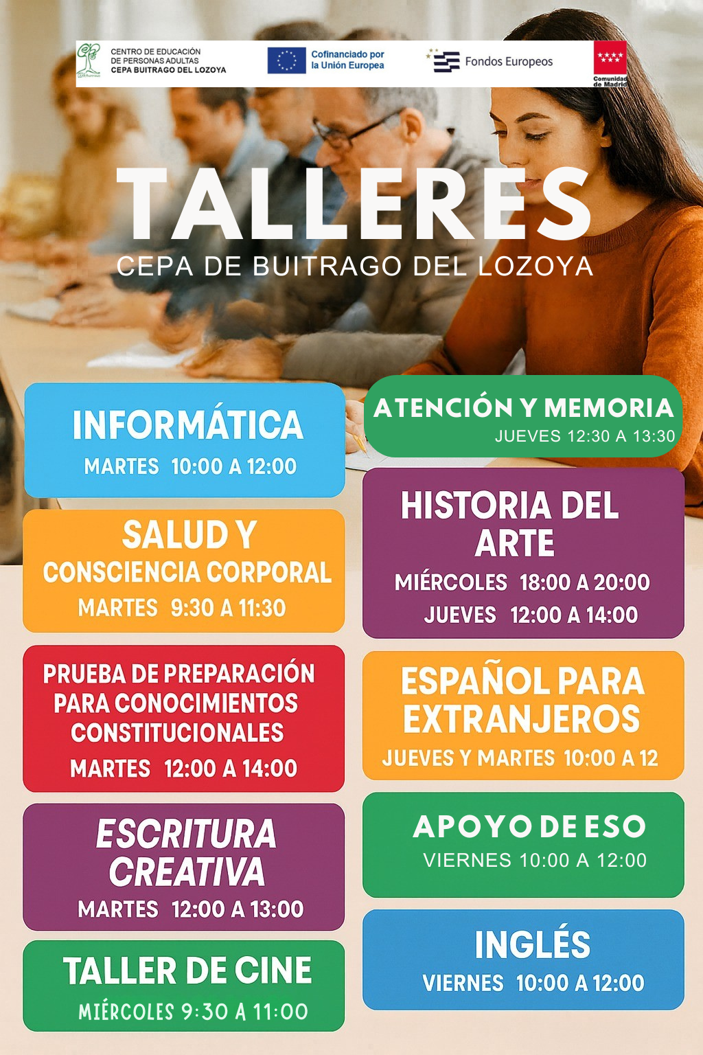 Viernes 26 de 18:00 a 20:00 en el Salón de Plenos o el Centro de Mayores (puedes decírselo a Sergio o a Belén)