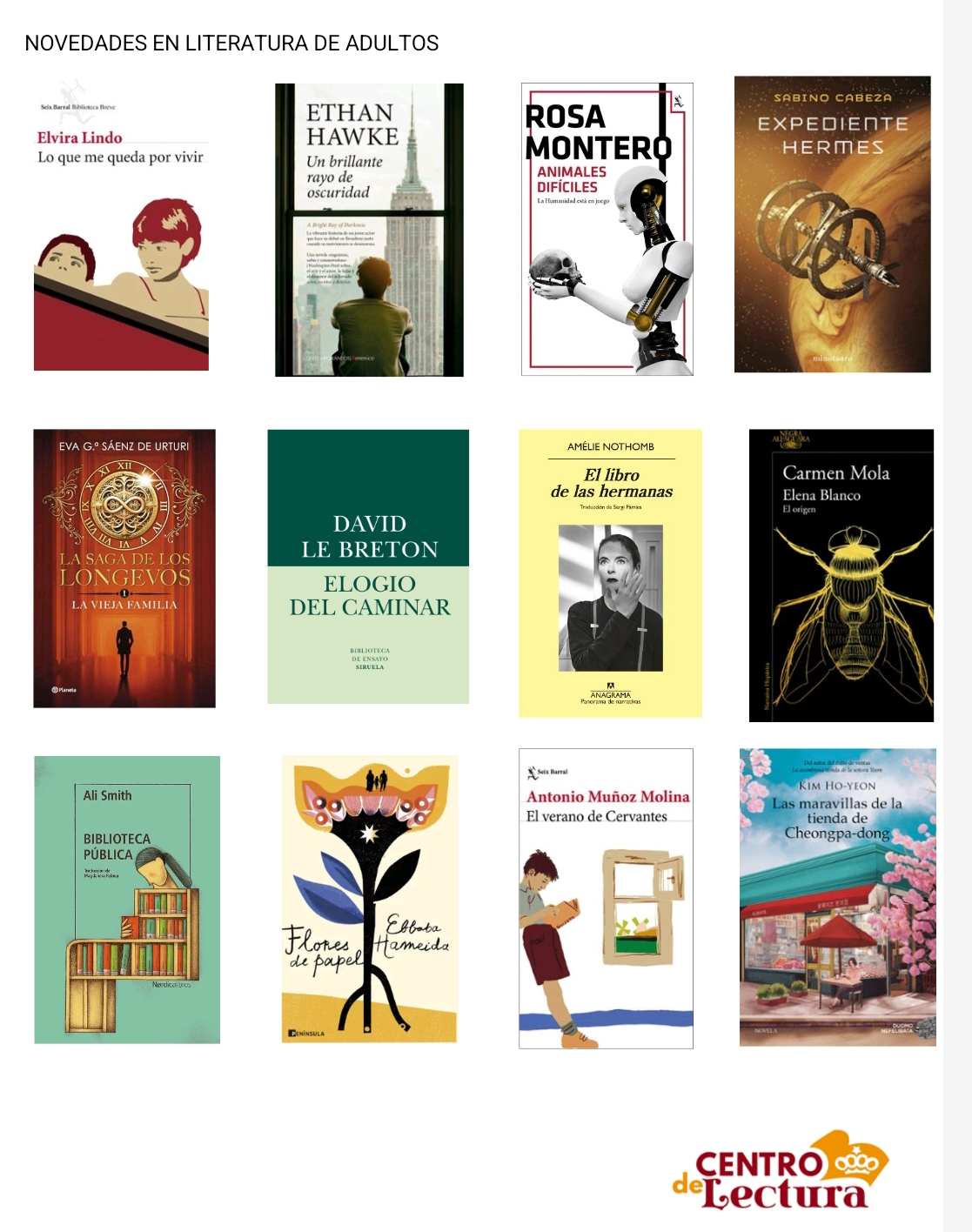 En los adjuntos encontrarás las últimas novedades en literatura infantil, juvenil y de adultos recién incorporadas a la biblioteca del Centro de Lectura 'Elvira Lindo'.