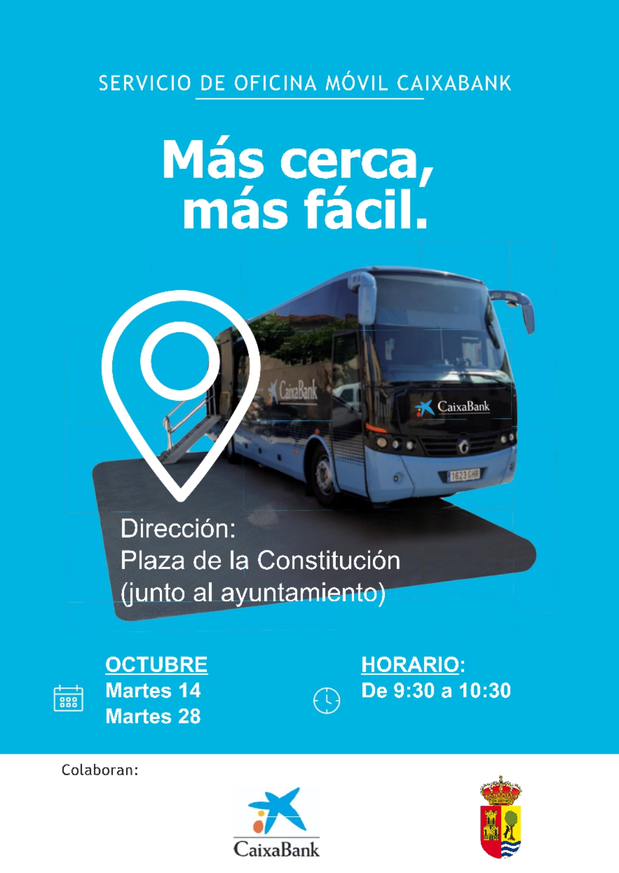 La ofimóvil de CaixaBank dará servicio (en la plaza de la Constitución, junto al ayuntamiento) las siguientes mañanas del mes de octubre: martes 14 y 28 (9:30-10:30 horas).