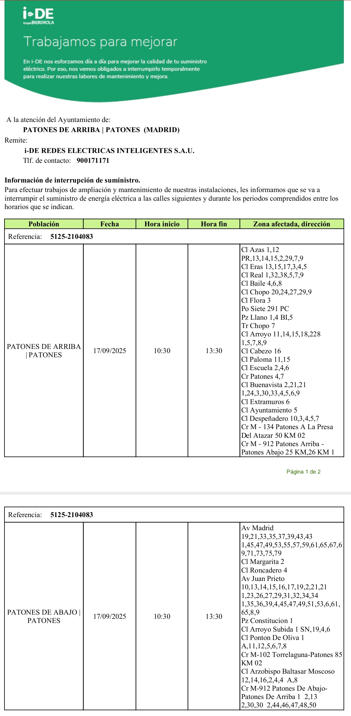 Trasladamos información recibida por el Ayuntamiento, de Iberdrola, sobre la interrupción del suministro de energía eléctrica (para efectuar trabajos de ampliación y mantenimiento de sus instalaciones) en las zonas de ambos núcleos de Patones que se detallan en el adjunto.