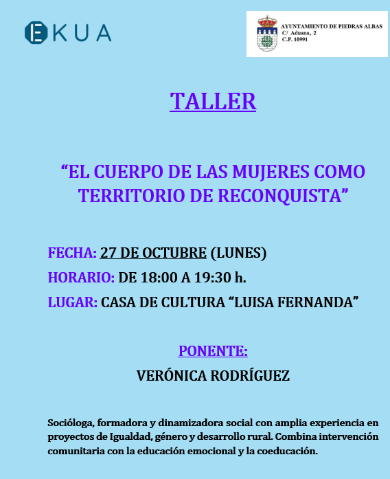 El lunes, 27 de octubre de 2025, a las 18:00 h, en la Casa de la Cultura Luisa Fernanda, se celebrará el taller titulado "El cuerpo de las mujeres como territorio de reconquista".
