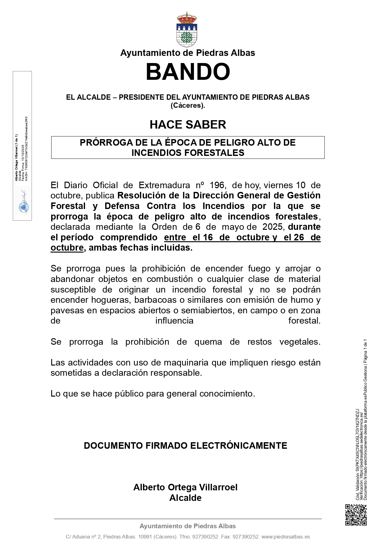El Diario Oficial de Extremadura nº 196, de hoy, viernes 10 de octubre, publica Resolución de la Dirección General de Gestión Forestal y Defensa Contra los Incendios por la que se prorroga la época de peligro alto de incendios forestales, declarada mediante la Orden de 6 de mayo de 2025, durante el período comprendido entre el 16 de octubre y el 26 de octubre, ambas fechas incluidas.