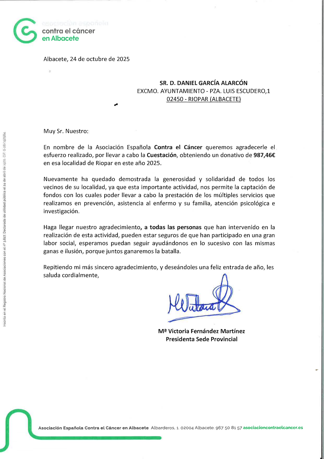 La Asociación Española Contra el Cáncer en Albacete nos ha enviado una carta de agradecimiento por la solidaridad y generosidad del pueblo de Riópar en la Cuestación que realizamos el pasado mes de agosto en favor de esta asociación. La cuantía recaudada fue 987,46€.