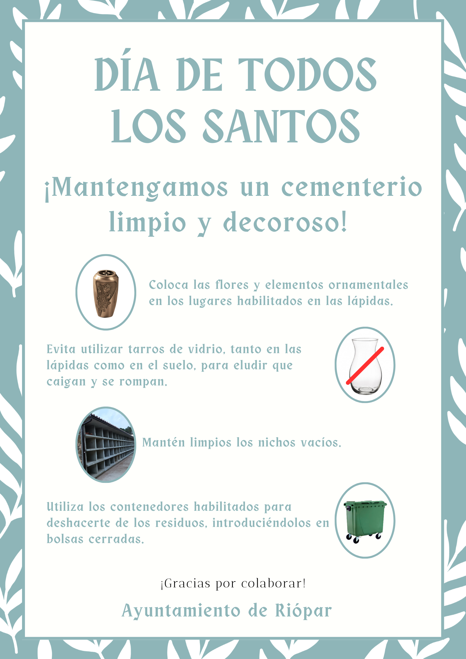 Con motivo de la festividad de Todos los Santos, desde el Ayuntamiento de Riópar, nos gustaría recomendar cuatro actuaciones básicas para mantener un cementerio limpio, digno y decoroso, actuaciones que debemos recordar durante todo el año, el lugar lo merece.