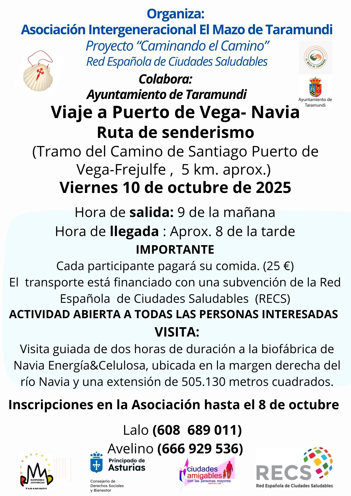 Seguimos "Caminando el Camino" a través de la Ayuda RECS concedida al Ayuntamiento de Taramundi con el objetivo de ir recorriendo tramos del Camino de Santiago en una actividad organizada por la Asociación Intergeneracional El Mazo. En esta ocasión nos vamos al concejo de Navia a realizar el tramo Puerto de Vega Frejulfe, una ruta de unos 5 km apta para personas de todas las edades y por la tarde se realizará una visita guiada a Ence Navia. Actividad con transporte gratuito abi(...)