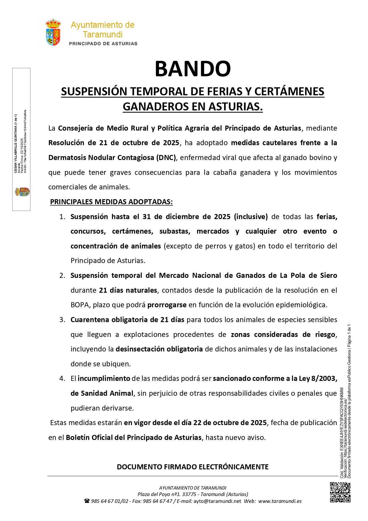 SUSPENSIÓN TEMPORAL DE FERIAS Y CERTÁMENES GANADEROS EN ASTURIAS