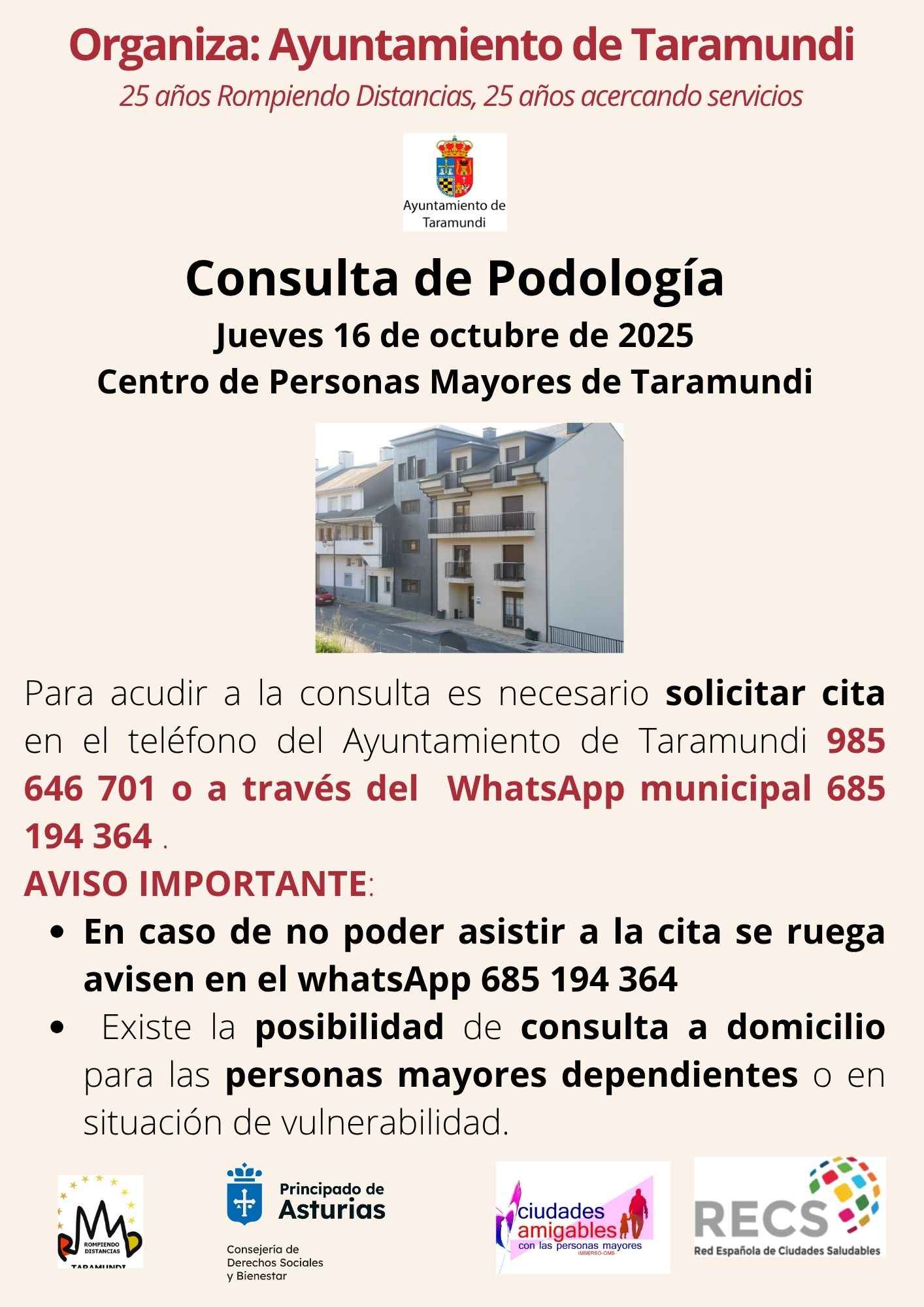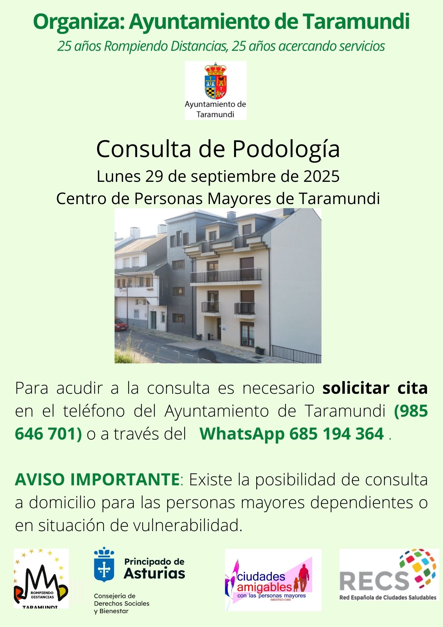 Próxima consulta de Podología: lunes 29 de septiembre de 2025. Centro de Personas Mayores de Taramundi.