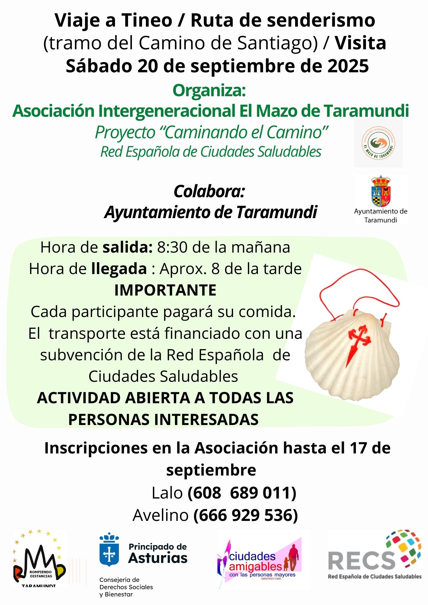 Vuelve el proyecto "Caminando el Camino" promovido por el Ayuntamiento de Taramundi a través de una subvención de la Red Española de Ciudades Saludables. Como el año pasado, la ejecución del Proyecto se hará con la colaboración de la Asociación Intergeneracional El Mazo que organizará la actividad. En 2025 se realizarán varios tramos del Camino de Santiago, y la primera ruta discurrirá por el concejo de Tineo.
