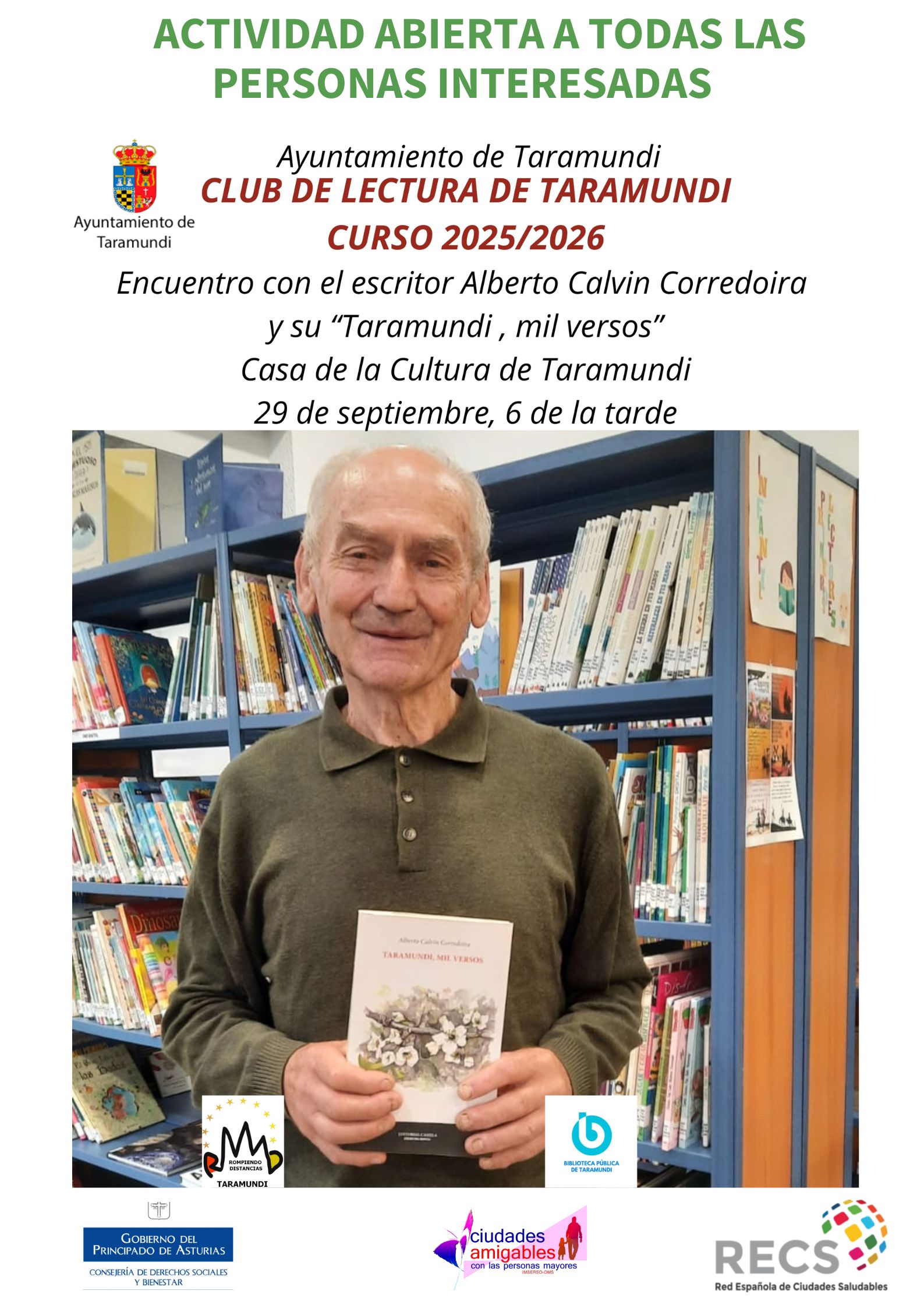 El lunes 29 de septiembre se reinician las actividades del Club de Lectura de Taramundi en la Casa de la Cultura con un encuentro con el escritor Alberto Calvin Corredoira y su "TARAMUNDI, MIL VERSOS". El acto es abierto a todas las personas interesadas y dará comienzo a las 6 de la tarde.