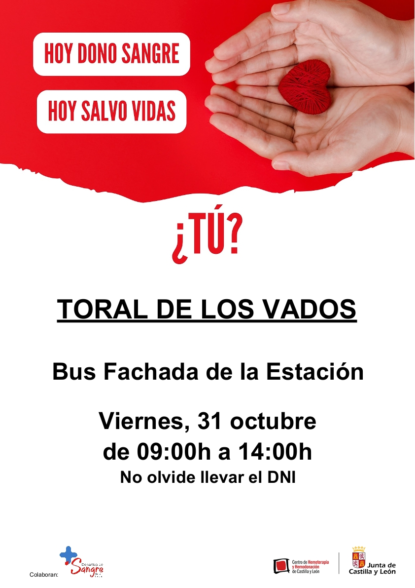 El centro de Hemoterapia y Hemodonación de Castilla y León informa que el próximo VIERNES 31 DE OCTUBRE de 2025, entre las 9:00 y las 14:00 horas, estará aparcado su autobús en la plaza de la estación para que todas aquellas personas que lo deseen puedan donar sangre. No olvidar llevar el DNI.