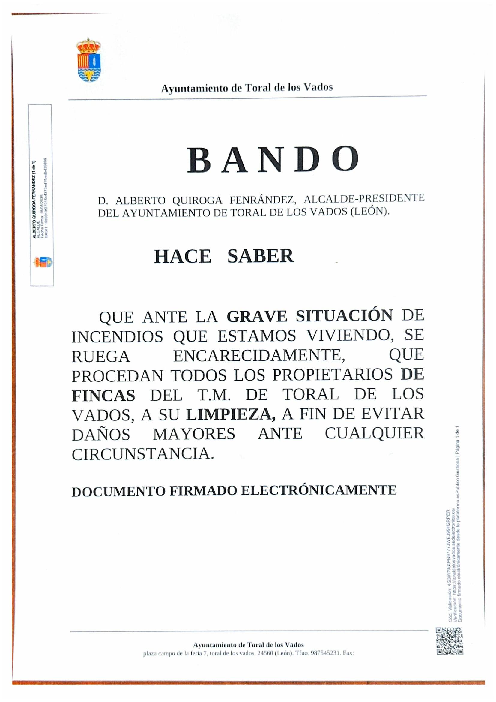 Ante la grave situación de incendios que estamos viviendo, se ruega encarecidamente que en el plazo de 3 días, los propietarios de fincas procedan a su limpieza a fin de evitar la propagación de los mismos.