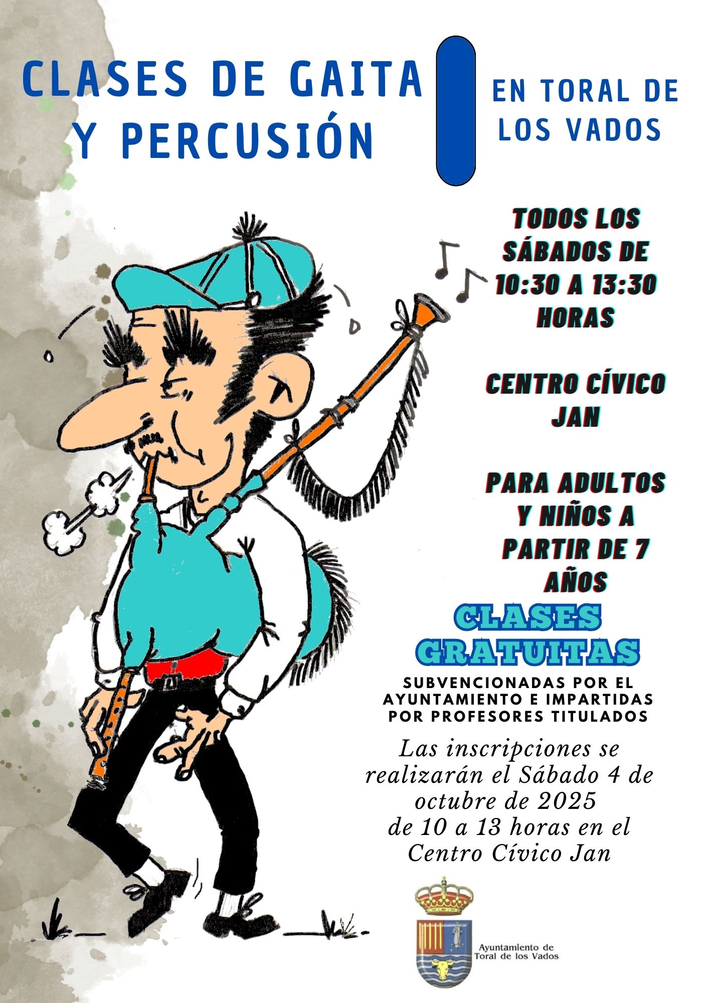 El próximo mes de octubre de 2025 darán comienzo, en el Centro Cívico Jan de Toral de los Vados, clases de gaita y percusión, para adultos y niños a partir de 7 años. Las clases serán totalmente gratuitas, ya que están financiadas por el Ayuntamiento de Toral de los Vados, y se impartirán los sábados en horario de 10:30 a 13:30 horas.