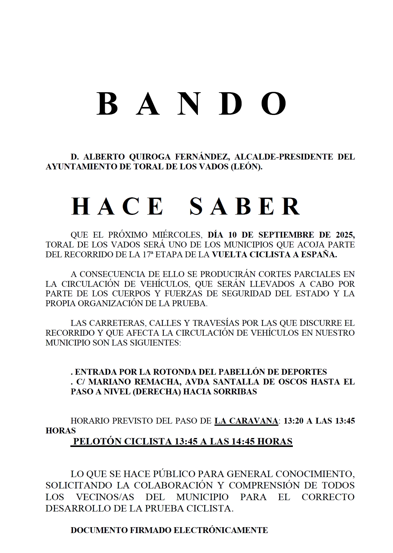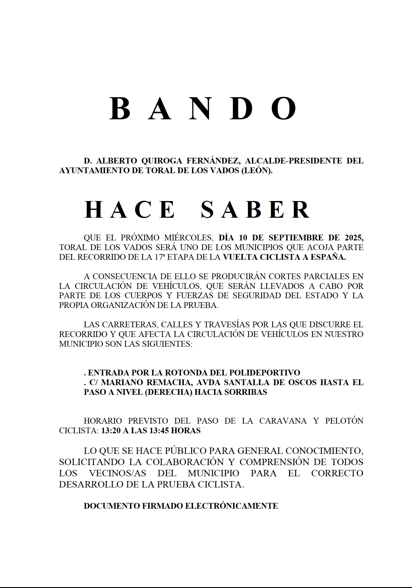 Que el próximo miércoles, día 10 de septiembre de 2025, Toral de los Vados será uno de los municipios que acoja parte del recorrido de la 17ª etapa de la VUELTA CICLISTA A ESPAÑA.