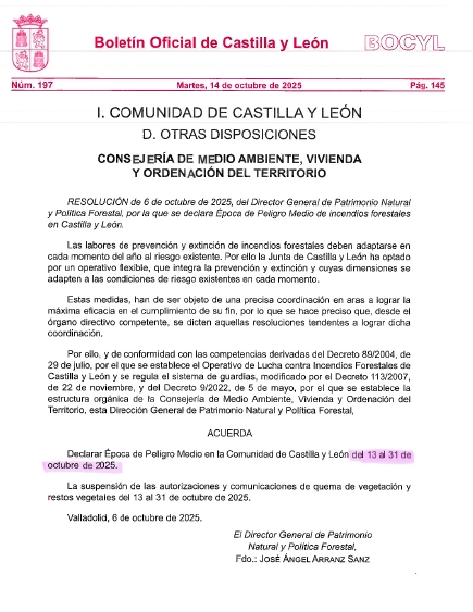 Se informa a la población que la Junta de Castilla y León ha ampliado la época de Peligro Medio de incendios forestales del 13 al 31 de octubre de 2025. Durante este periodo, no se permiten quemas agrícolas ni de restos vegetales. Así se recoge en el BOCYL Nº197, publicado el 14 de octubre de 2025, página 145.