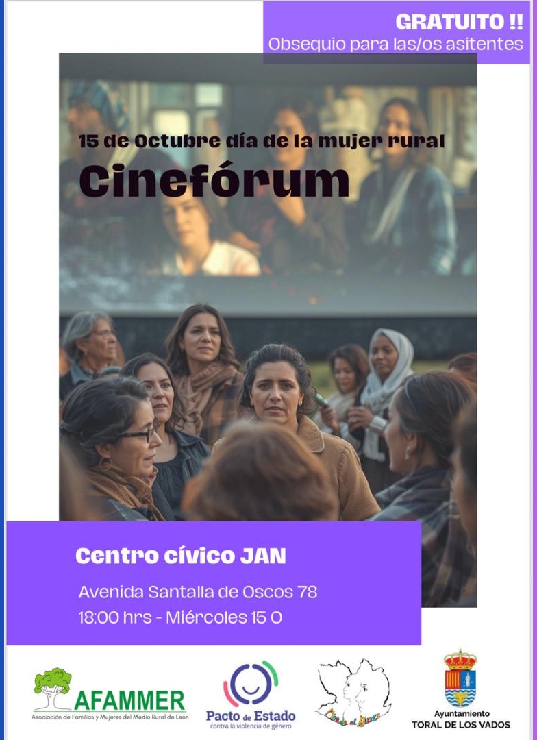 Con motivo del Día Internacional de la Mujer Rural, el miércoles 15 de octubre se celebrará en el CENTRO CÍVICO JAN de Toral de los Vados un Cinefórum gratuito dirigido a todas las personas interesadas. La actividad dará comienzo a las 18:00 horas con la proyección de un corto centrado en las experiencias y realidades de las mujeres rurales, que refleja su vida cotidiana, desafíos y contribuciones a la sociedad.