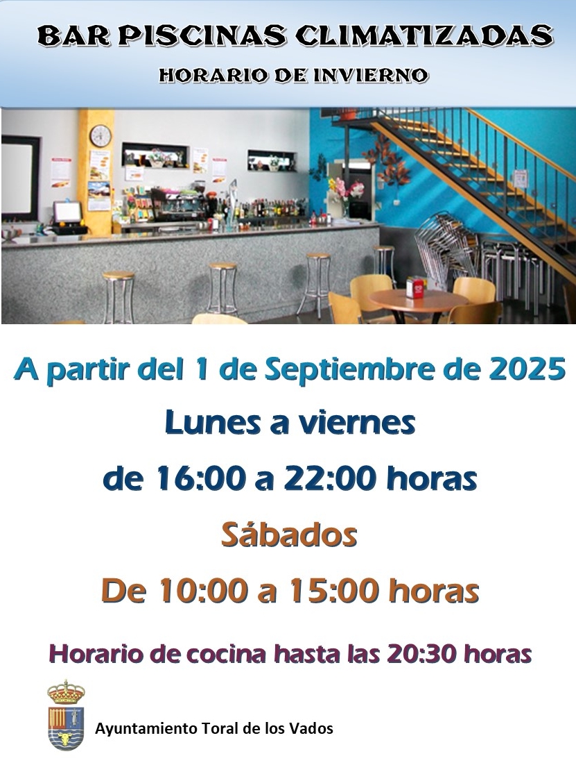 HORARIO DE INVIERNO EN EL BAR DE LAS PISCINAS CLIMATIZADAS DE TORAL DE LOS VADOS