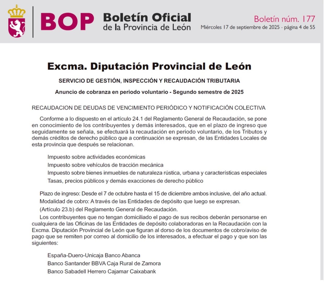El Ayuntamiento de Toral de los Vados informa a todos los vecinos y vecinas que, conforme al anuncio publicado por la Diputación Provincial de León en el BOP Nº 177 de miércoles 17 de Septiembre de 2025, se abre el plazo de cobranza en periodo voluntario para diversos tributos municipales correspondientes al segundo semestre del 2025.