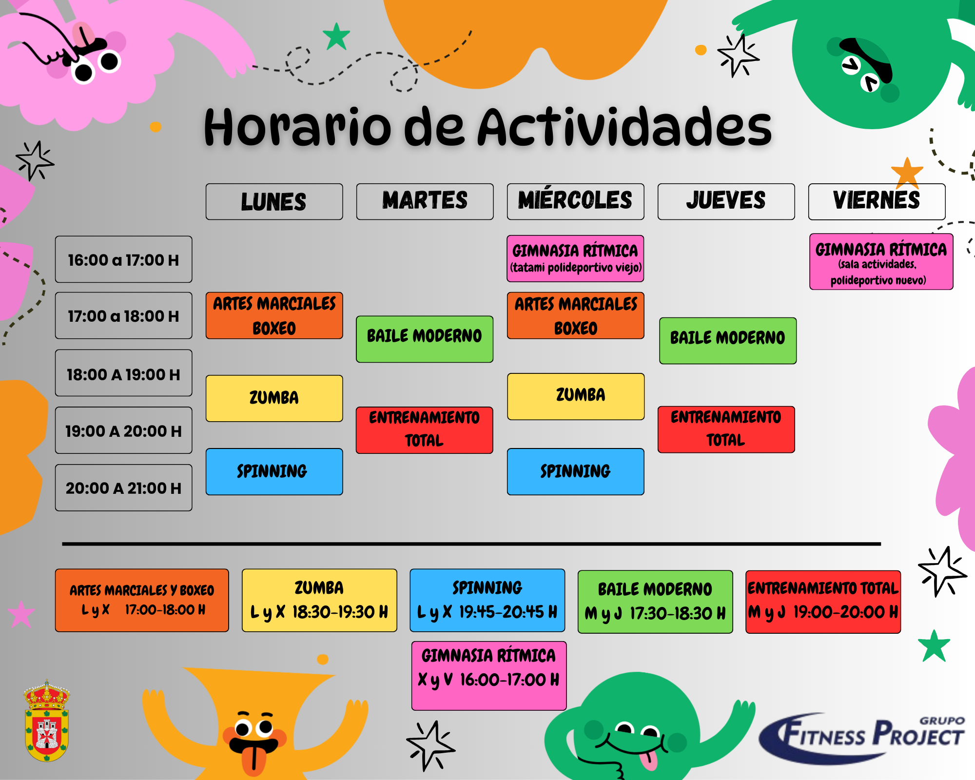 El Ayuntamiento de Torija anuncia el inicio de las actividades dirigidas para la nueva temporada 2025/2026, que darán comienzo el próximo miércoles 1 de octubre. La oferta está dirigida a todas las edades e incluye disciplinas tan variadas como artes marciales (Kick boxing, K1) y boxeo, zumba, spinning, baile moderno, entrenamiento total y gimnasia rítmica, con horarios distribuidos entre las tardes de lunes a viernes para adaptarse a las necesidades de los vecinos.