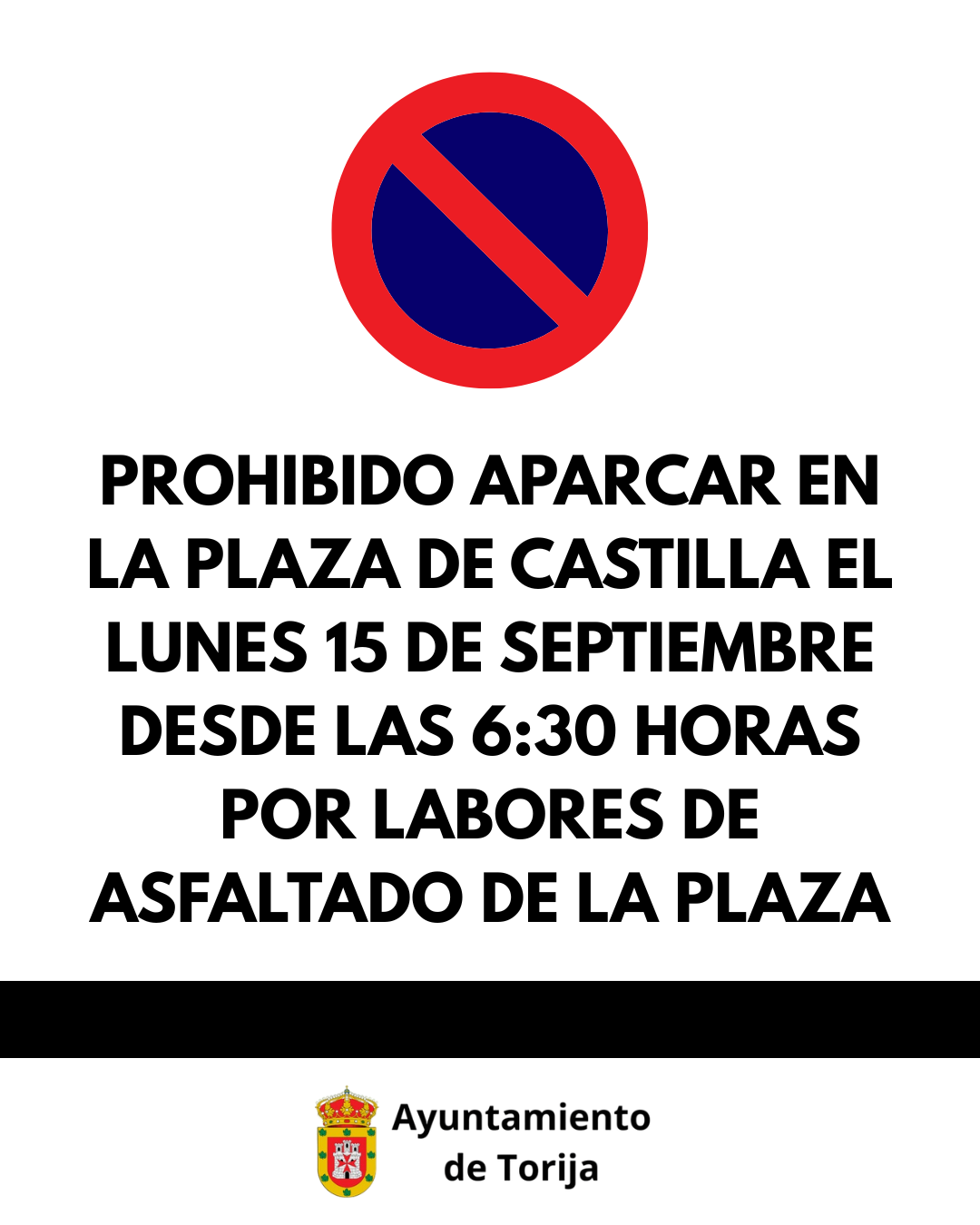 El Ayuntamiento de Torija informa que, con motivo de los trabajos de mantenimiento que la Excma. Diputación de Guadalajara realizará en nuestro emblemático Castillo y de la celebración de la Feria Chica 2025, se establecerá una prohibición de estacionamiento en la Plaza de la Villa.