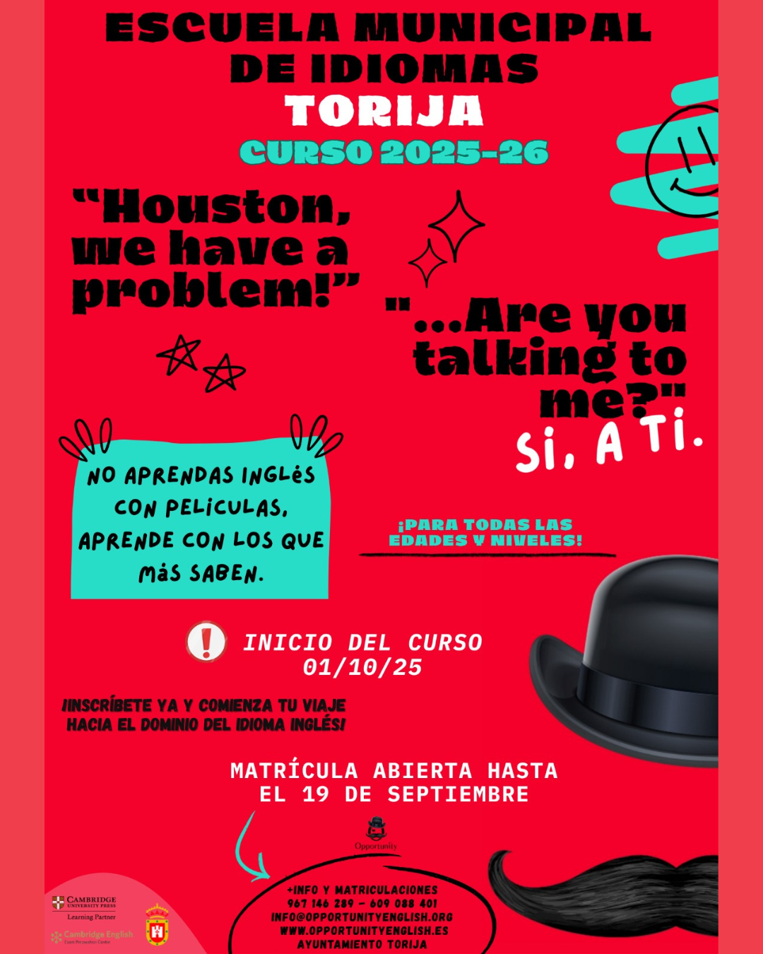 La localidad de Torija comenzará el 1 de octubre el curso 2025-26 en su Escuela Municipal de Idiomas, con un que tiene como objetivo ofrecer una enseñanza de calidad alejada de los métodos tradicionales basados en películas. Bajo el lema "No aprendas inglés con películas, aprende con los que más saben", la iniciativa municipal busca proporcionar una formación sólida y efectiva a todos los vecinos.
