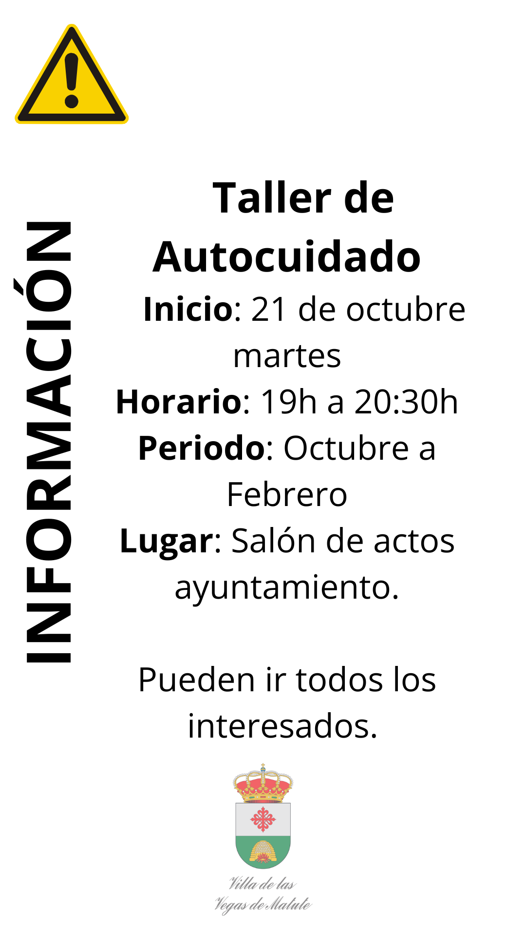 Buenas tardes, el próximo martes 21 de octubre comienzas las clases de autocuidado que se celebrarán a las 19h en el salón de actos del ayuntamiento.