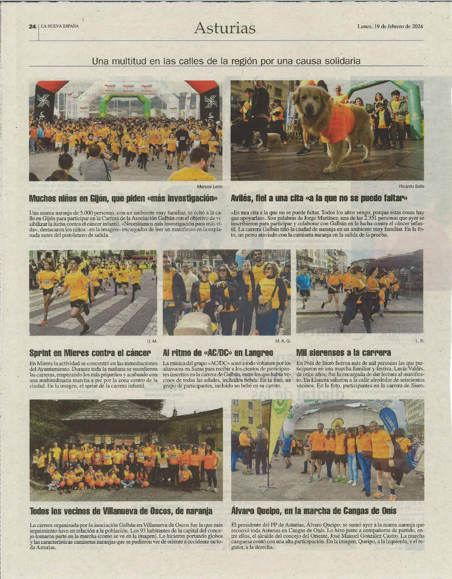 El pasado domingo Villanueva de Oscos se teñía de naranja con Galbán, sumándonos así con 94 personas de todas las edades (93 personas a fecha de la carrera y una donación recibida al día siguiente) a esta gran marea de solidaridad que ha tenido lugar por toda Asturias, con la Carrera Corre con Galbán 2024 contra el Cáncer Infantil.