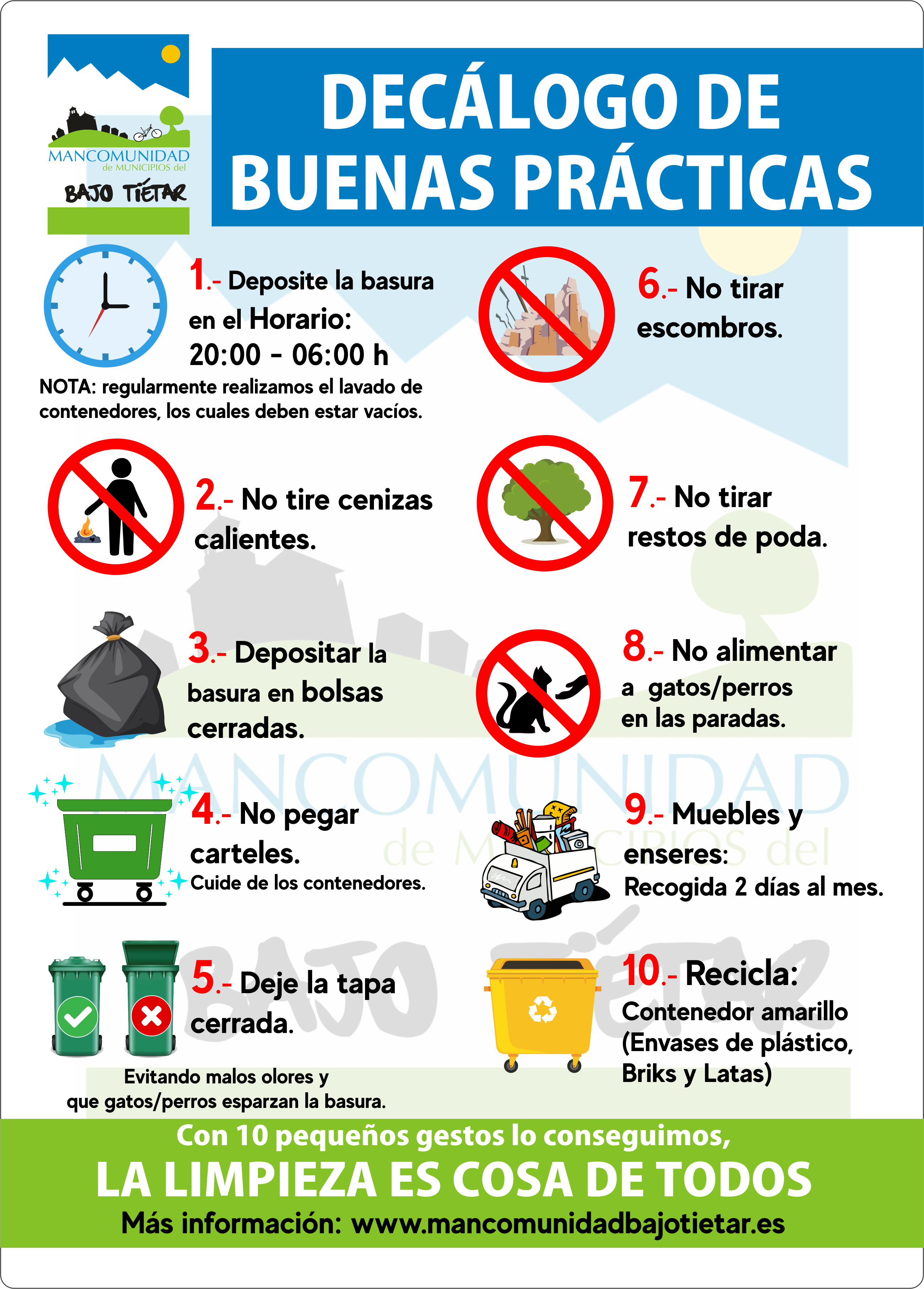 Se recuerda que está terminantemente prohibido depositar escombros y restos de poda o cualquier otro resto de jardinería en los contenedores. La basura debe depositarse en bolsas cerradas y dentro del contenedor, cerrándolo tras su depósito. El horario para depositar la basura es desde las 20:00 h. hasta las 06:00 h. Se ruega a todo el vecindario la adecuada gestión en la eliminación (...)