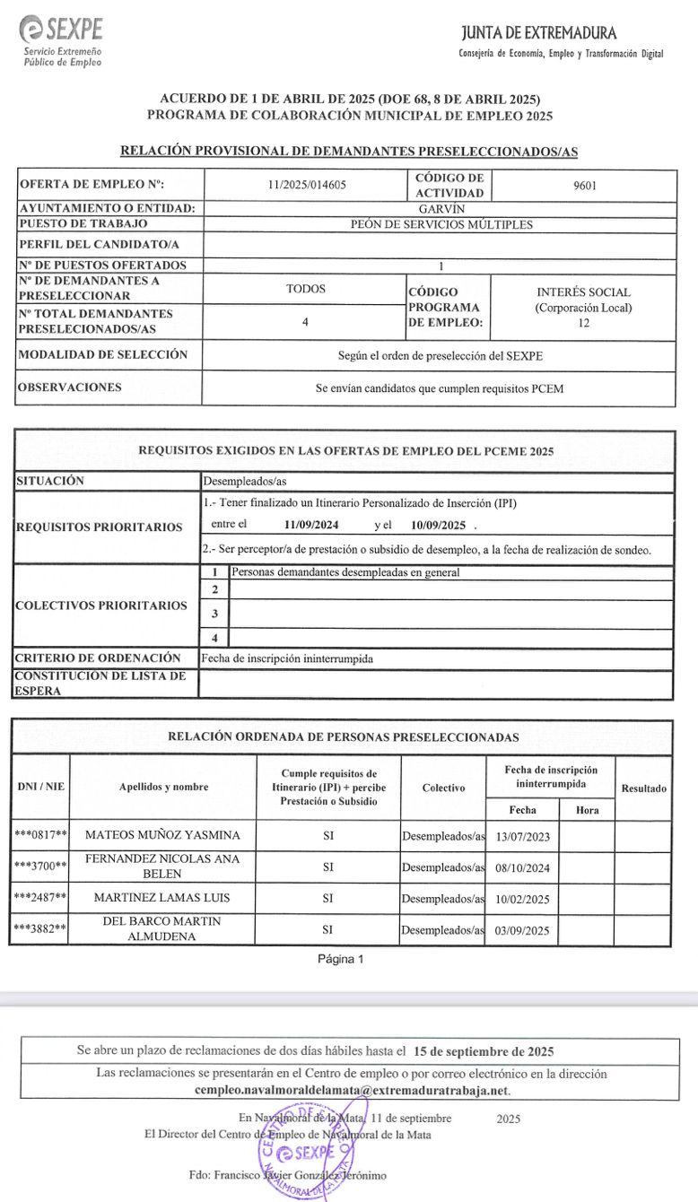 Las reclamaciones serán presentadas en el SEXPE mediante correo electrónico enviado a cempleo.navalmoraldelamata@extremaduratrabaja.net hasta las 14 horas del lunes 15 de septiembre de 2025.
