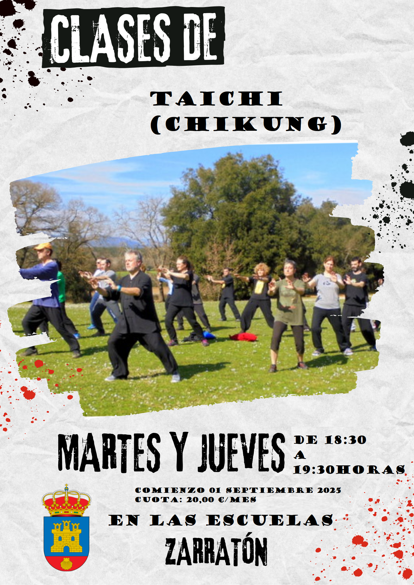 A partir del próximo día 01 de septiembre de 2025 los martes y jueves en horario de 18:30 horas a 19:30 horas se impartirán en las escuelas de Zarratón clases de Taichi (chikung).